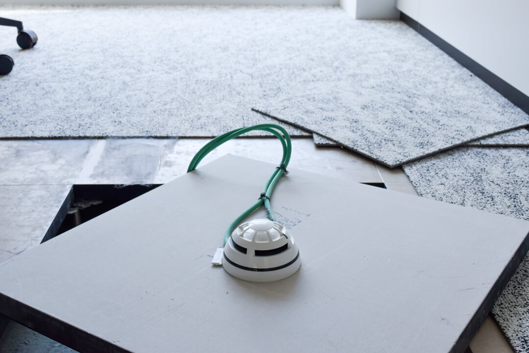 In this project, OBO underfloor systems were used in a very special manner: The cover of the GES9M-2 service outlets were used as access points for the testing and maintenance of underfloor smoke detectors. In the building, attempts were made to use as little plastic as possible. In accordance with this principle, a decision was taken to use the stainless steel version of the OBO underfloor solutions. For simple installation, the exact opening dimensions were sprayed out of the floor tiles using a water jet.