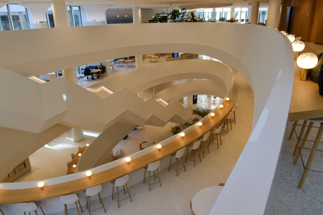 In the building, great value was placed on sustainable construction. It comprises a total of 100,000 square metres, which are distributed across 10 storeys above the ground and 5 below. Solar panels are installed on the roof, rainwater is collected and reused and there is a thermal energy capacitor in the basement. A total of 330 cycle racks and 160 charging stations for electric vehicles make it easy for employees to get to work in an environmentally friendly manner.