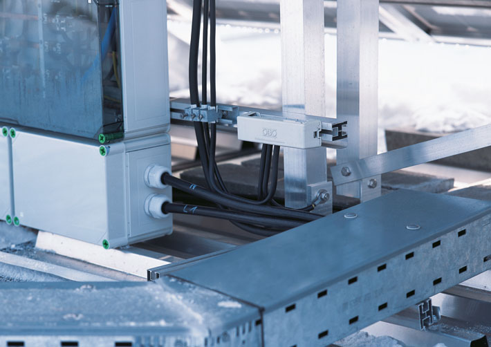 The project managers were convinced by the practical system components. Around one kilometre of perforated sheet steel trays of type SKS were installed in the system. The trays start directly at the rear side of the solar modules and carry the cables from there into the interior of the building. The different surfaces and materials of the cable trays provide safe corrosion protection. In addition, the cables are fastened with series clips and U clamps from OBO. This means that wind and weathering have no effect on the cables. The system is even protected against storms. Amongst other things, by the OBO equipotential bonding systems, which earth the surge voltage conductors.