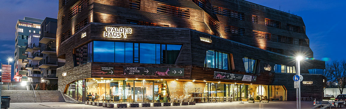 Across 6,000 m,2 the building provides space for the interactive exhibition "Science Center Wald", as well as for events, seminars, gastronomy and a hotel. The building is designed for sustainability, an optimised and low-CO2 energy supply and environmentally sound management. In addition, an innovative fire protection concept was implemented in accordance with the new European structural design regulations (Eurocodes), which was a new development in the history of timber construction.