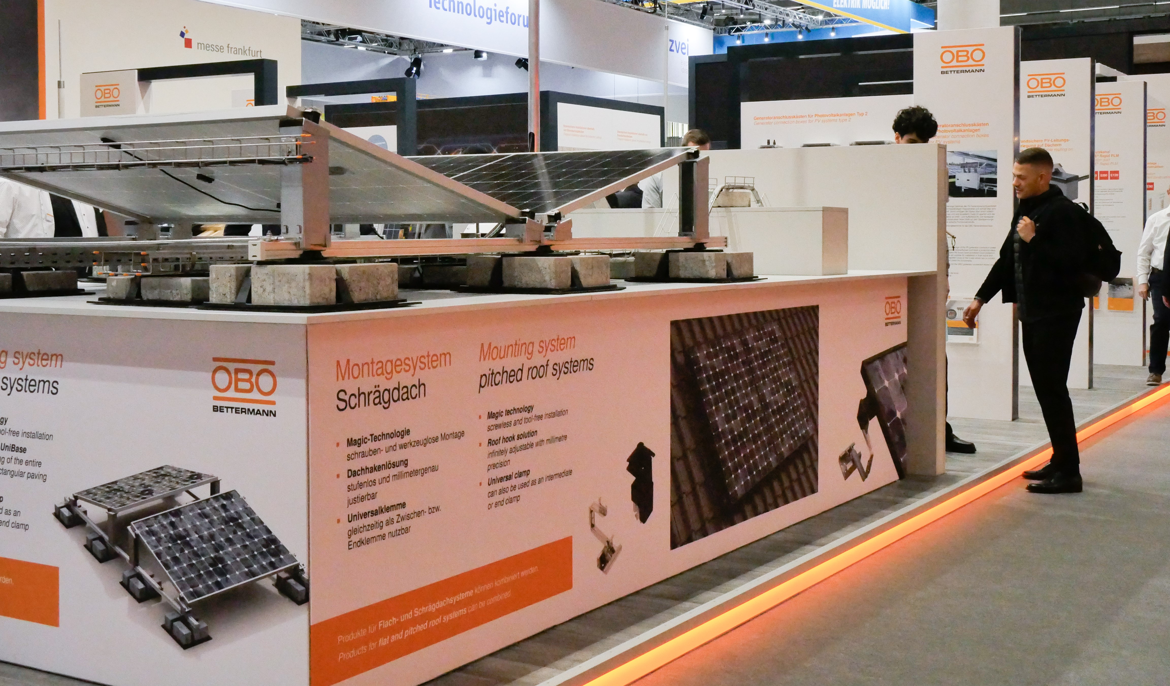 For the safety of your PV system, we offer a complete package that fulfils almost all electrotechnical requirements – from lightning and surge protection to earthing and equipotential bonding and cable routing. Innovative mounting systems for pitched-roof, flat-roof and free-standing systems broaden our portfolio. Get more information about our PV solutions at the OBO trade fair stand. Our OBO experts would be happy to answer all your questions.
