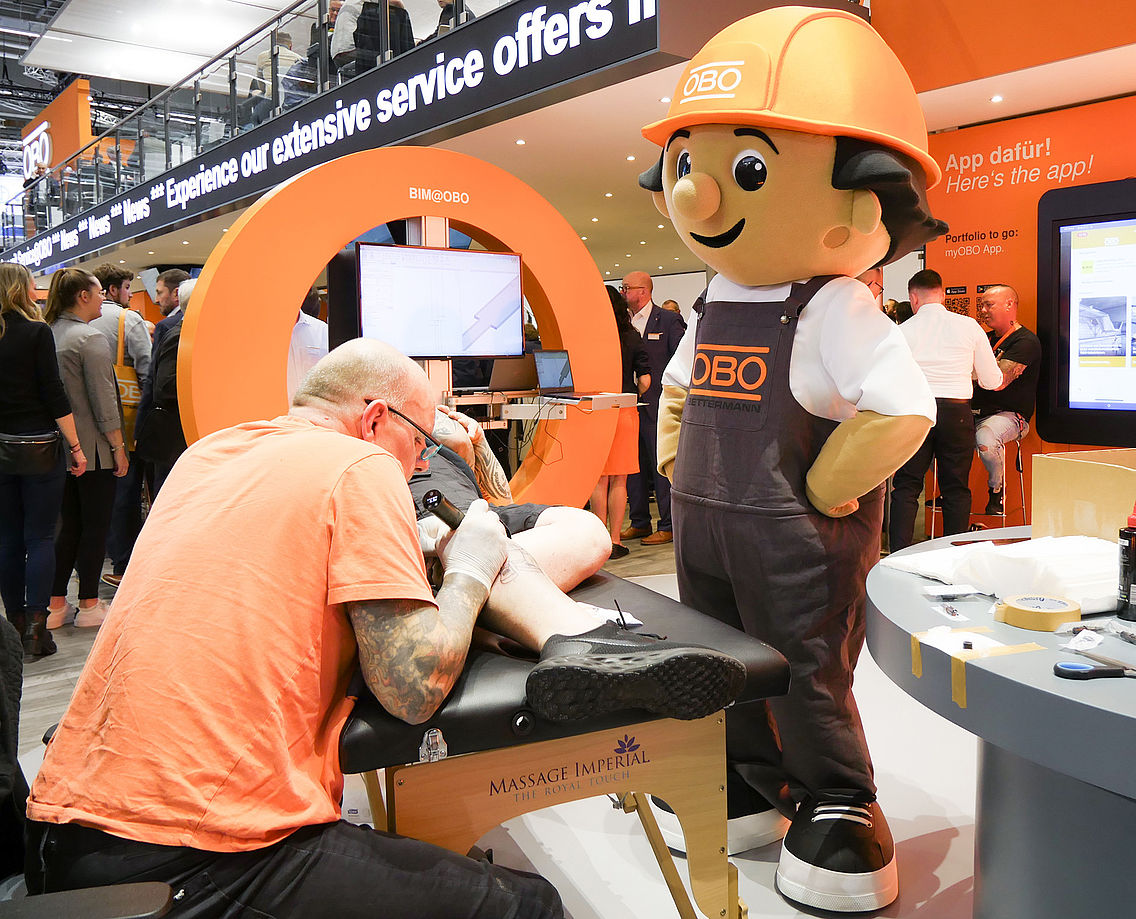 A live tattoo at the OBO trade fair stand? Yes, you read that correctly. Perhaps you’ll recall Joachim Dancker, who we have already introduced you to on our social media channels. He survived a major electric shock and has covered some of the injuries he received with tattoos – including an OBO man on his calf. When our mascot was given his new look, Mr Dancker was sure that he needed a further tattoo with our new mascot. At Light + Building, he made his plan a reality – and all the visitors to our OBO trade fair stand could be there, live. This was surely the one item of our accompanying programme that got under everyone’s skin. However, competitions and expert presentations were also a part of this year’s events.