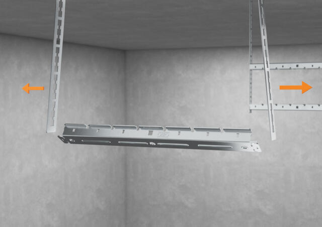 The MagicFix support rail is mounted using suspension strips. These are fixed to the ceiling using a suitable fastening system. The support rail is available in lengths of 500 mm, 1,000 mm, 1,500 mm and 2,000 mm. The selection of anchors and fasteners depends on the existing substrate and the expected load values. Simply inserted into the suspension strips, the support rail is quickly mounted and can be adjusted in height without tools. The suspended support rail can optionally be secured by bending the hooked fastening tabs in the suspension strips. Alternatively, the protective cap, which is compatible with both the fastening tabs and the ends of the suspension strips, can be attached directly. Due to the recesses in the suspension strips for different height settings, multilayer installations are also possible without having to remove pre-assembled rungs.