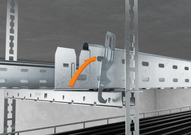 As an additional safety measure for the mesh cable tray and to secure cable trays and ladders to the support rail, a special quick fastener can be used. This quick fastener is hooked into the support rail and can be bent over the cable tray or ladder rail by hand without the need for tools, or with pliers. Alternatively, the classic screw connection is also possible, as integrated slots in the support rail allow conventional fastening of cable trays and cable ladders.