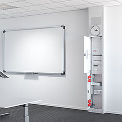 The height of the powder-coated steel pole can be adjusted thanks to the telescopic cover. The removable side parts ensure simple retrofitting and uncomplicated seating of microphones and signal emitters via C-rails behind the perforated sheet. A wall clock can be refitted easily at a corresponding empty field. Likewise, installation of switching and plug-in devices on the front or access-protected behind a lockable door is possible. The new media and communication pole is just as adaptable as the demands placed on it. It offers sufficient space for additional installations and can be quickly and easily retrofitted with a school communication platform. As a result, the pole provides all required configurations and covers all requirements placed on the technical building equipment of a modern school. The OBO experts will be happy to advise you.