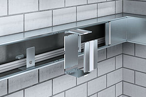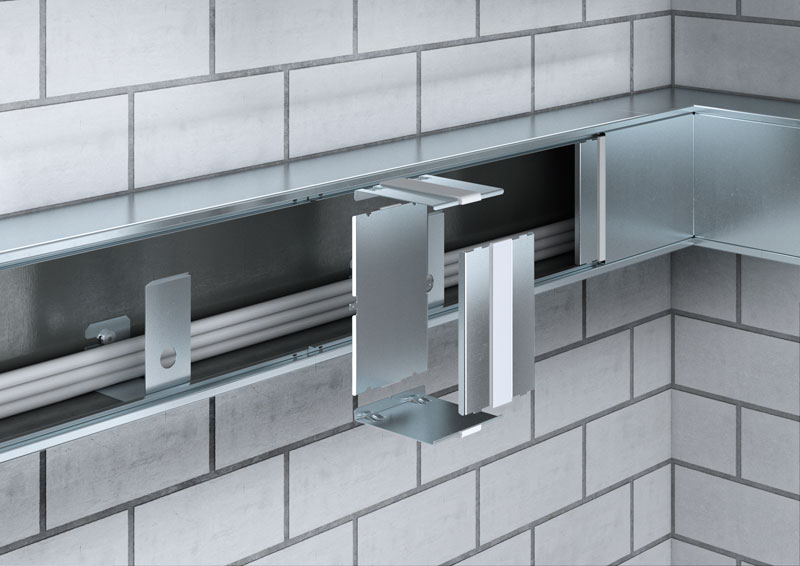 On the outside, the fire protection duct cannot be distinguished from electrical installation duct once the installation has been completed. This is due to the patented, internal connection and sealing technology. The internal connector set means that the fire protection duct system is connected and closed in such a way that it is smoke gas-tight. The internal connection system also offers additional benefits, such as the option of mounting in a room corner or with no spacing to other units. Also, the standard mounting type, with an offset between the joint of the duct trough and the joint of the duct cover, can be implemented using the connection system.