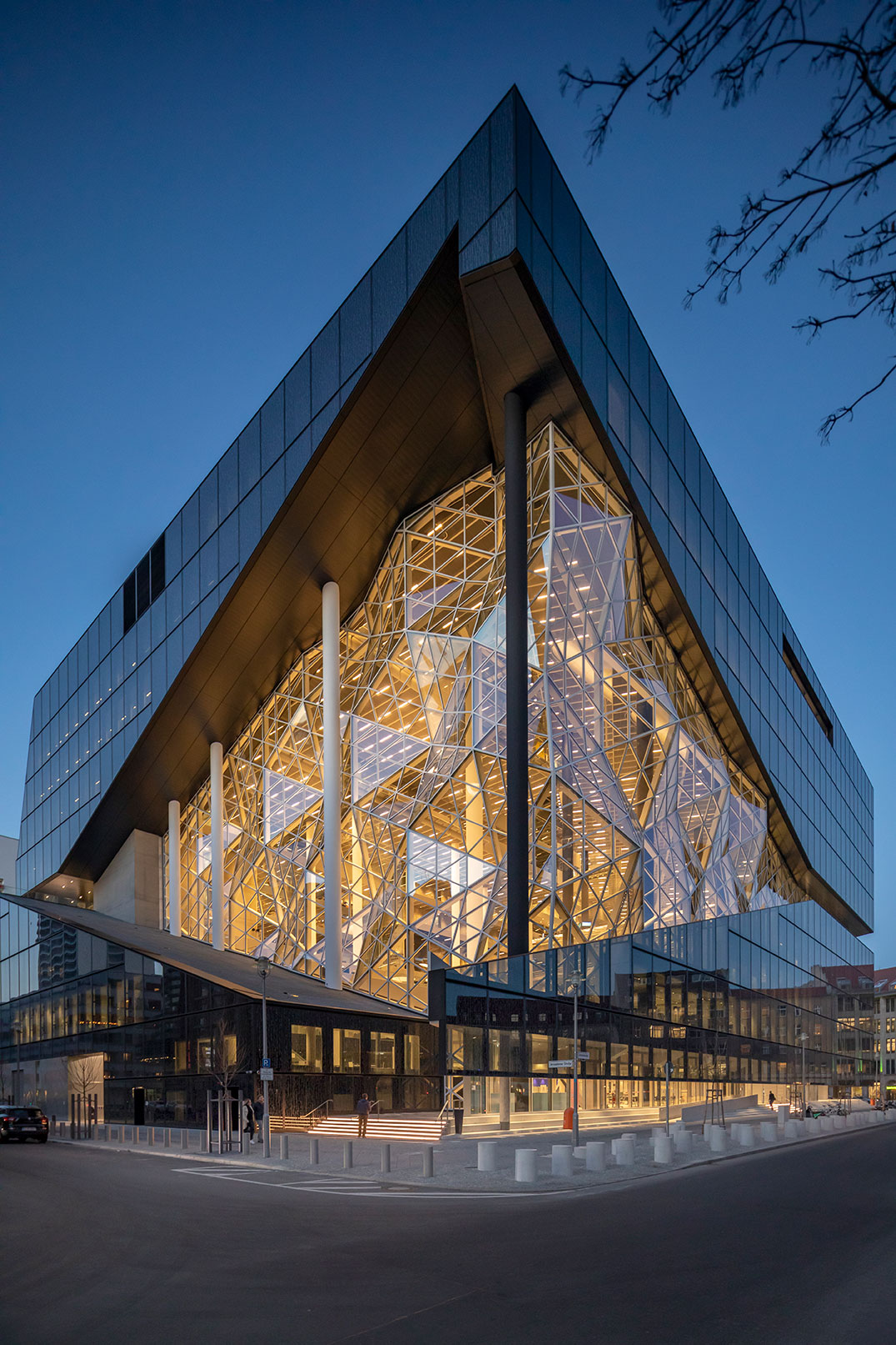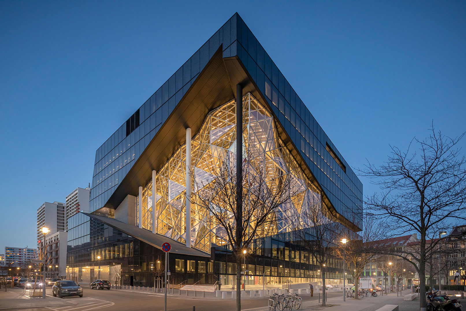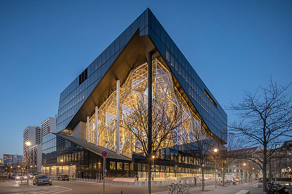 Miteinander verbundene Terrassen im Inneren, viele Glasflächen und ein 45 Meter hohes Atrium prägen das Gebäude, welches sich zu den bestehenden Verlagsgebäuden und zur Stadt hin öffnet.