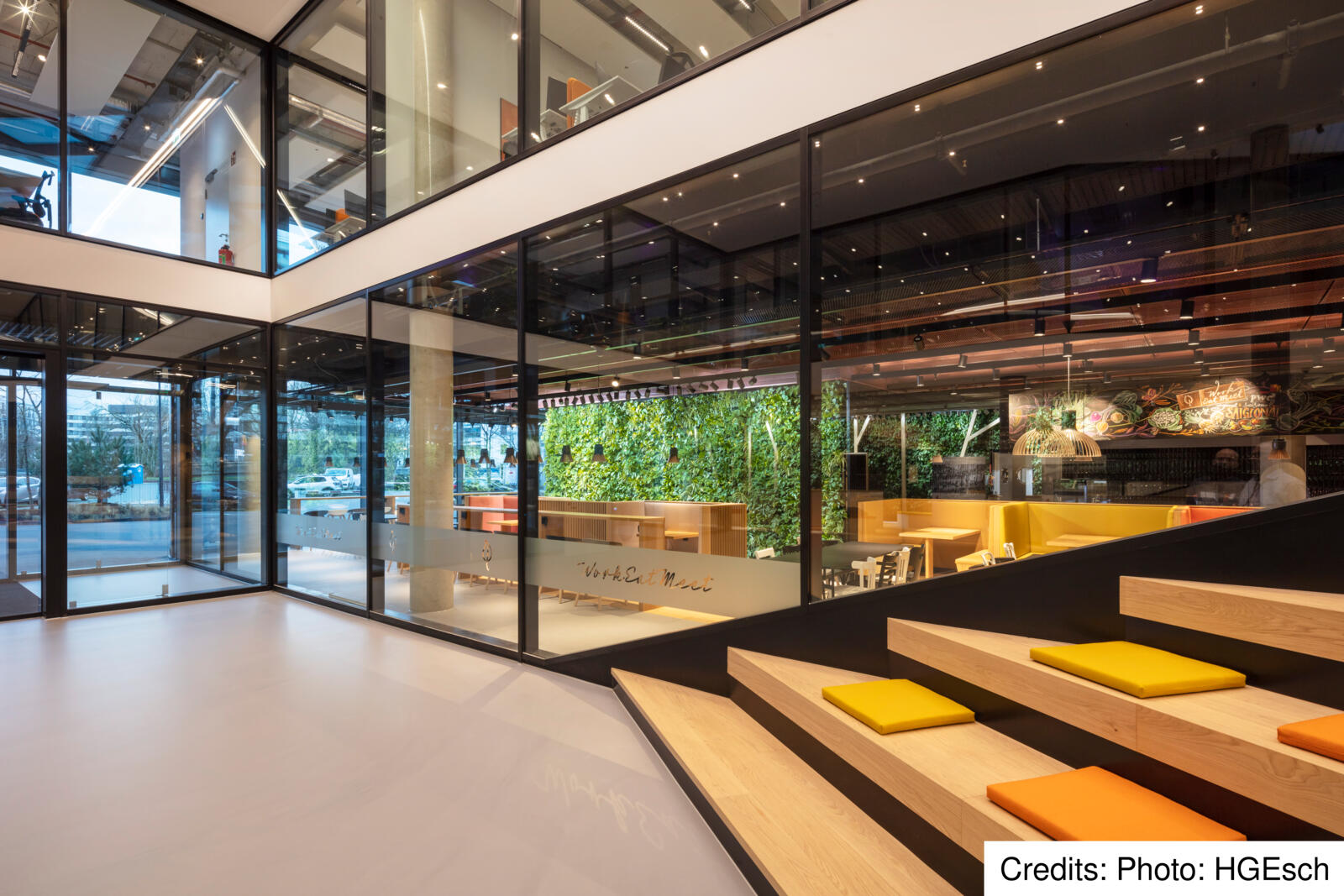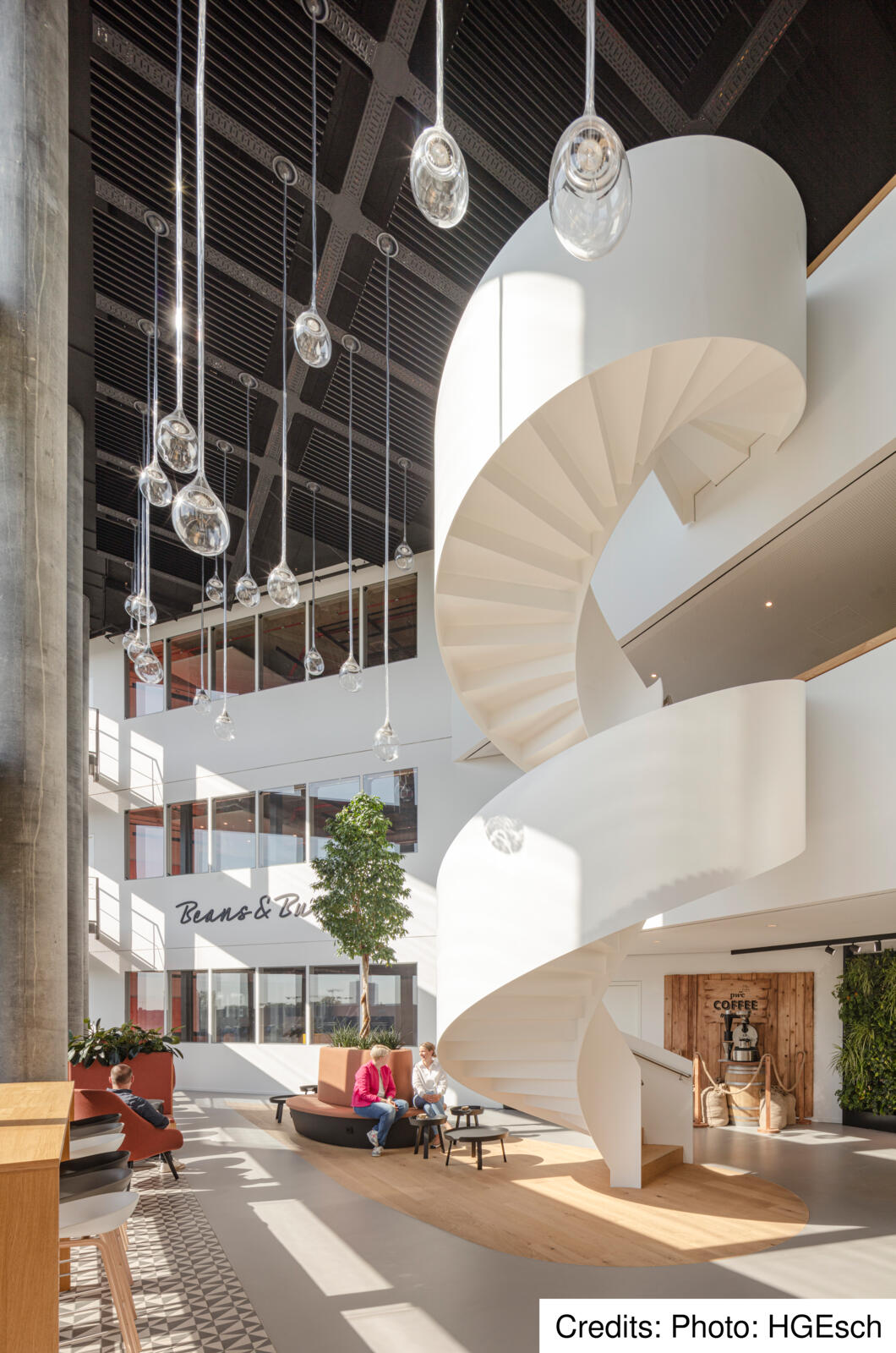Aufgrund der Lage des Eclipse, umgeben von zwei sich kreuzenden Bundesstraßen mit hoher Lärmentwicklung im Außenbereich, befinden sich die Aufenthaltsflächen für die Nutzer von Eclipse im Wesentlichen im Inneren des Bürogebäudes. Herzstück sind die Atrien und Lichthöfe, die sich auf mehreren Etagen befinden und teils über drei Geschosse ragen. In diesen Atrien finden die Mitarbeiter verschiedenste Aufenthaltsbereiche, wie eine Cafeteria oder einen Veranstaltungssaal, die auch von außen betrachtet deutlich in der Fassade ablesbar sind. Dort, wo die planen Fensterflächen in der Glasfassade zu sehen sind, verbinden sich die Lichthöfe und formen einen „vertikalen Campus“, der bis zur Dachterrasse mit weitläufigem Blick über die Stadt reicht. „Das Eclipse agiert als ein Kommunikator und schafft eine städtische Verbindung zwischen Nachbarschaft und Arbeitswelt“ sagt Werner Sübai, Senior Partner HPP Architekten. Beim Bau des Gebäudes spielte auch das Thema Nachhaltigkeit eine große Rolle.