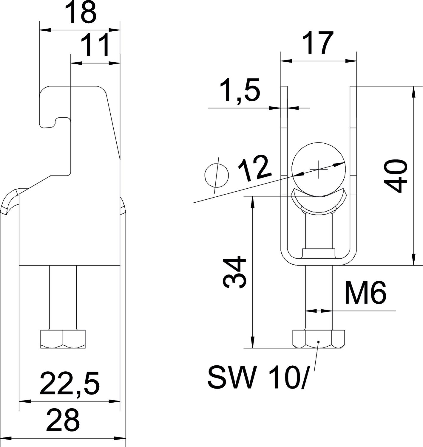 Accesorio de material Acero Accesorio de superficie Galvanizado en caliente Altura 40 mm Ancho 17 mm Ancho de ranura 10 mm Con bandeja metálica sí Con contramediacaña no Dimensión 08-12mm Espesor de chapa 1,5 mm Huella de CO2 (GWP) Cradle-to-Gate 0,0852 kg CO2e / 1 Unidad Libre de halógenos sí Longitud 22,5 mm Longitud, dimensiones exteriores 28 mm Mantenimiento de función sí Material Acero Material de la bandeja Acero Máx. Par de apriete 3 Nm Medida A 22,5 mm Medida B 17 mm Medida C 28 mm Medida G (mm) M6 Medida H 40 mm Medida L 34 mm Medida t 1,5 mm Modo de montaje Perfiles en C Número de cables / tubos 1 Para carriles con ancho de ranura (con intervalo) máx. 22 mm Para carriles con ancho de ranura (con intervalo) mín. 18 mm Para diámetro de tubo máx. 12 mm Para diámetro de tubo mín. 8 mm Rango de sujeción D máx. 12 mm Rango de sujeción D mín. 8 mm Rosca M6 Superficie Galvanizado por inmersión en caliente - Todos los tipos