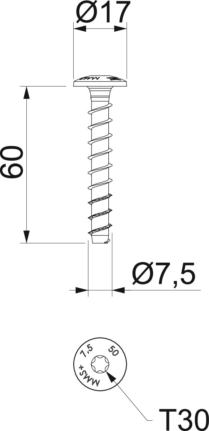 Color zinc Diámetro de la cabeza 17 mm Diámetro de rosca ST 7,5 Diámetro del orificio mín. 6 mm Dimensión 7,5x60 endurecido sí Espesor de apriete 25 mm Fire resistance class EN 13501-1 R30, R60, R90, R120 Forma de la cabeza Cup head Longitud 60 mm Longitud del taco 60 mm Material Acero Medida L 60 mm Profundidad del agujero 40 mm Rosca 7,5 Sistema roscado Torx Superficie Galvanizado Tamaño 7,5 x 60 - Todos los tipos
