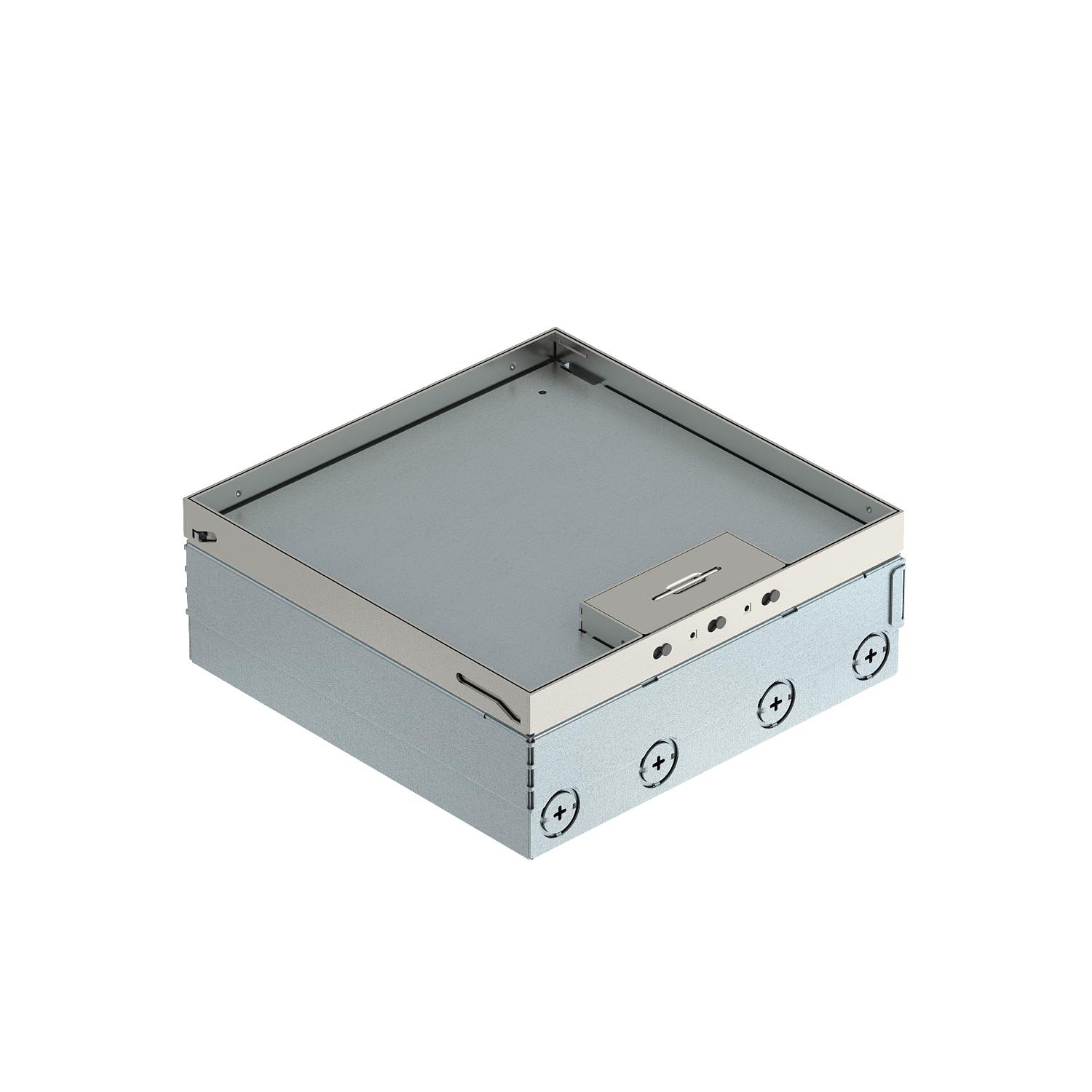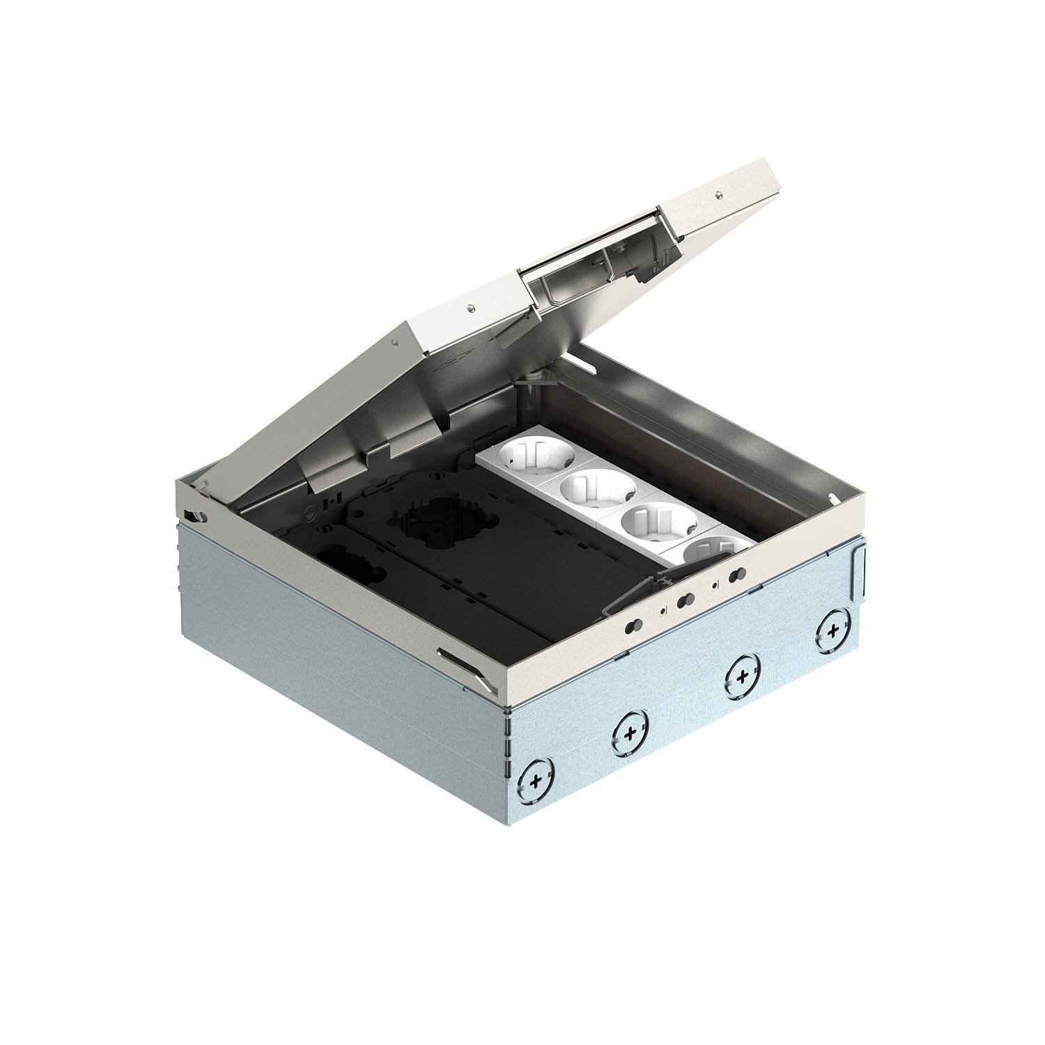 Descripción de productoDepósito de suelo cuadrado para el uso en suelos huecos tratados en seco y suelos de mortero de interior. La carcasa empotrable dispone de entradas pretroqueladas para tubo (M25). Con 3 soportes universales UT4 y dos tomas de tierra dobles. Parte superior ajustable mediante 4 soportes de nivelación en el borde superior del revestimiento de suelo. La profundidad mínima de montaje es de 95 mm y el margen de nivelación de + 30 mm.