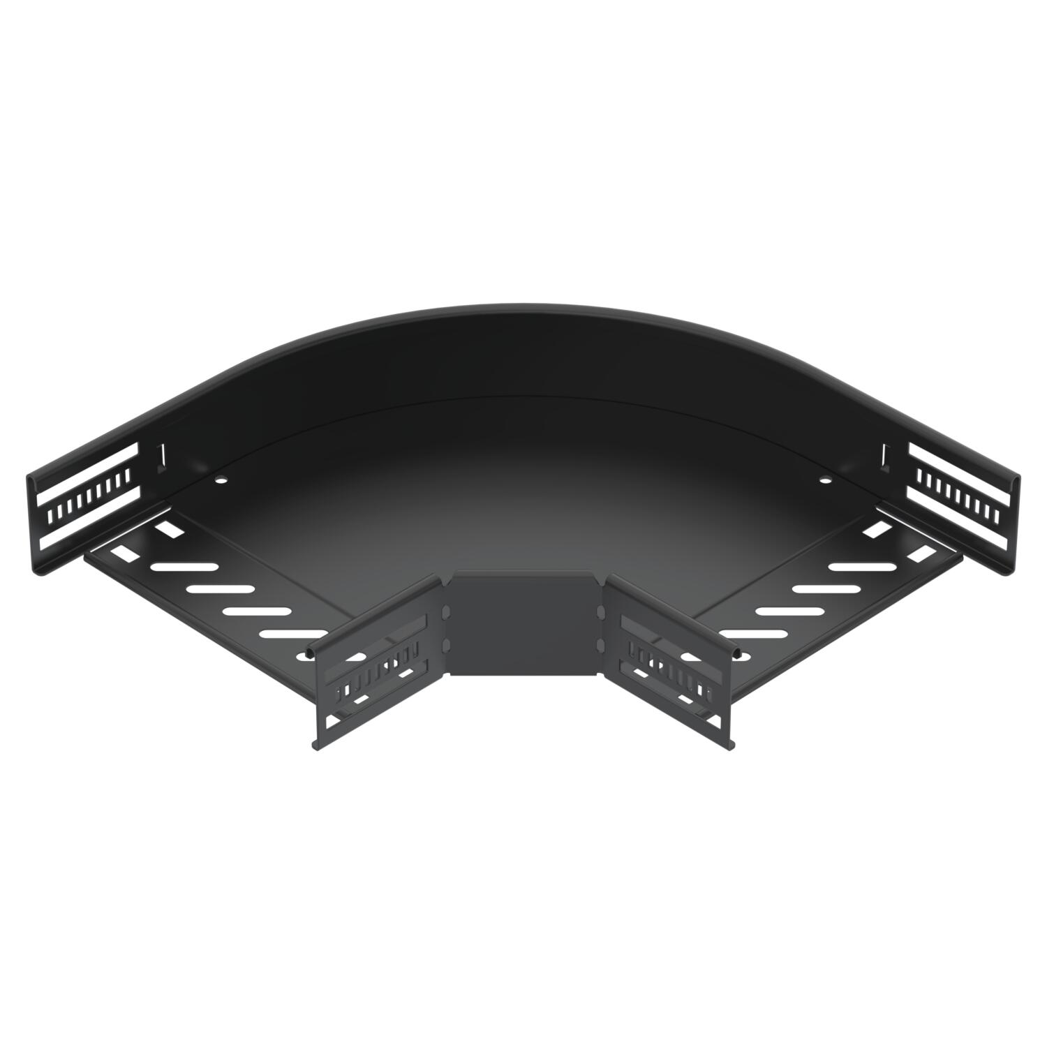 Descripción de productoCodo de 90°, horizontal, pieza moldeada para todos los tipos de bandejas portacables con una altura lateral de 60 mm. Revestimiento en negro.