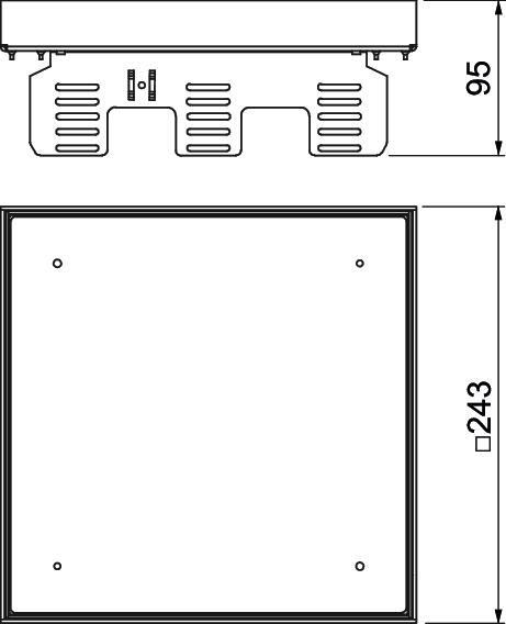 Descripción de productoCaja de nivelación "ciega", desacoplada del suelo, para crear una abertura de inspección de tamaño nominal 9 en suelos secos o húmedos en interiores, para instalación en cajas bajo suelo UZD250 o UZD350, en cada caso en combinación con una tapa de montaje DUG./9 o en UGD250-3/9 o UGD350-3/9. El montaje se efectúa mediante un ángulo de nivelación (pedir por separado) en el perfil del marco de aluminio de las cajas bajo suelo. Sólo son apropiados para pavimentos pulidos.