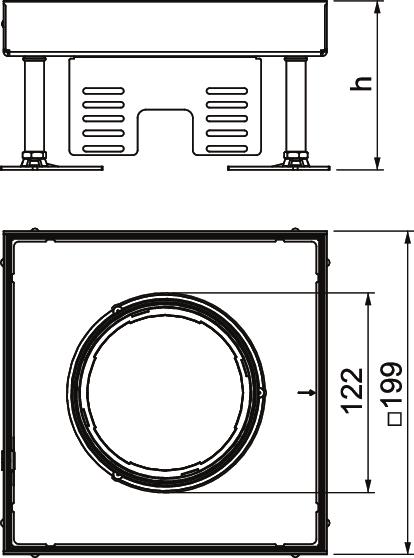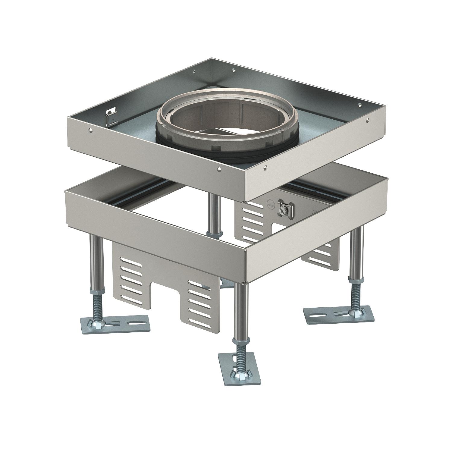 Descripción de productoConjunto de tapa y marco cuadrado de altura regulable para tubos de tamaño nominal 4 para montar dispositivos de instalación en sistemas de canalización, suelos dobles y huecos en suelos limpiados en seco o en húmedo en interiores. Clase de protección: IP X5.