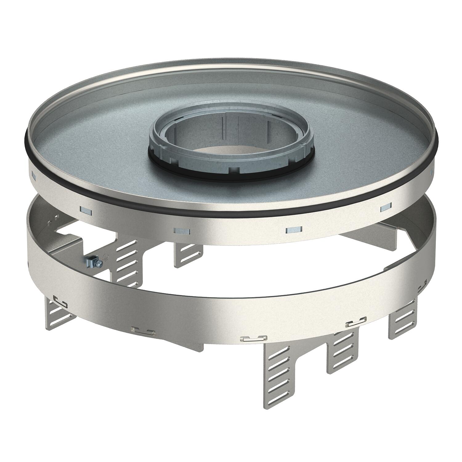 Caja nivelable y desacoplada del suelo del tamaño nominal R9, para tubo, para el montaje de sistemas de instalación en suelos que requieren limpieza en seco o con agua en zonas interiores, para el montaje en cajas bajo suelo UZD350-3 en combinación con una tapa de montaje DUG350-3R9. El montaje se efectúa mediante ángulos de nivelación (pedir por separado) en el perfil del marco de aluminio de las cajas bajo suelo.