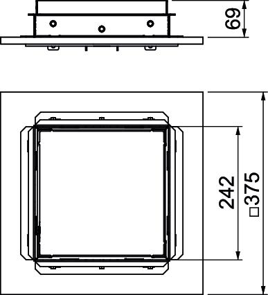 Conjunto de tapa y marco con altura regulable con tapa ciega. El volumen de suministro incluye una tapa de protección de pavimento de aluminio (apta para lijar), una tapa de montaje adecuada para la fijación del cuerpo de encofrado del conjuntos de tapa y marco y un faldón ISO para el desacoplamiento de la caja de empalmes bajo el suelo.