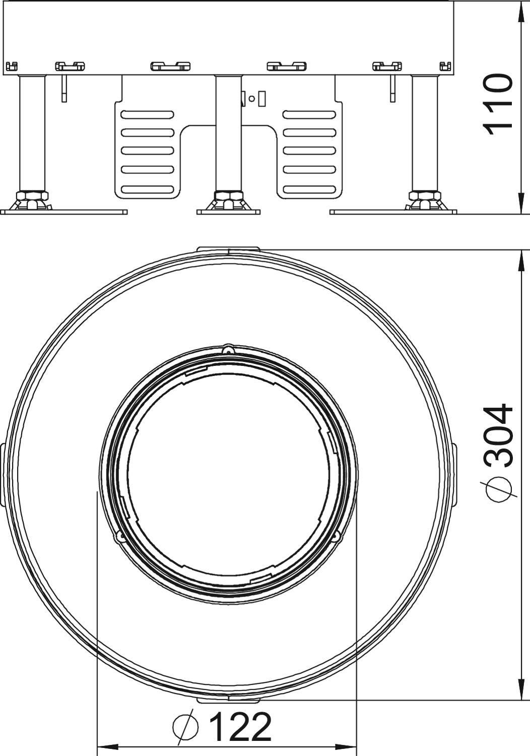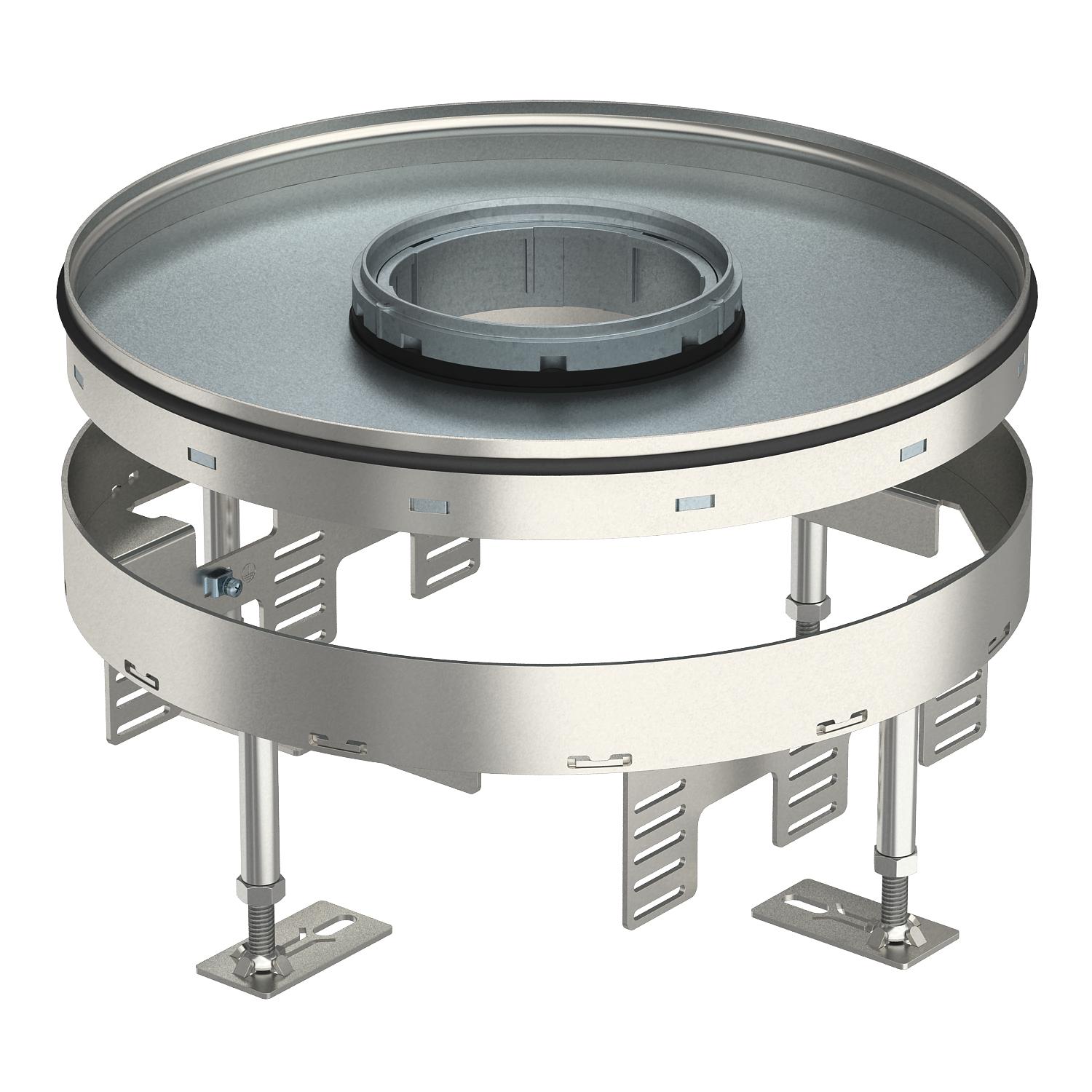 Caja para cargas pesadas redonda nivelable, 3 compartimentos, para tubo del tamaño nominal 9. Para la instalación en sistemas de canalización, suelos técnicos y suelos huecos en suelos que requieren limpieza en seco o con agua, en zonas interiores. Clase de carga 2 hasta 20 kN. Se pueden montar 3 tapas APMT5.