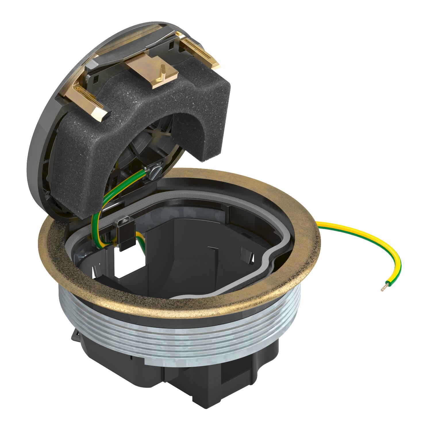 Descripción de productoUnidad de montaje redonda con marco para acabado de pavimento para montaje directo en la unidad de conexión UDL2-120. Cuando la unidad está cerrada se puede limpiar con agua. La profundidad mínima de montaje es de 70 mm.