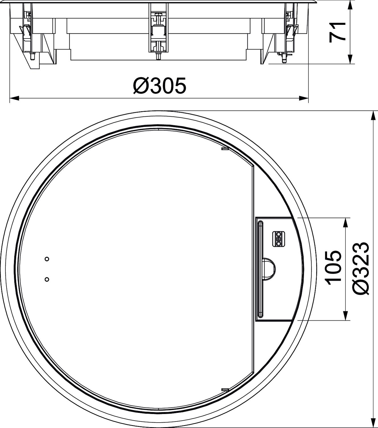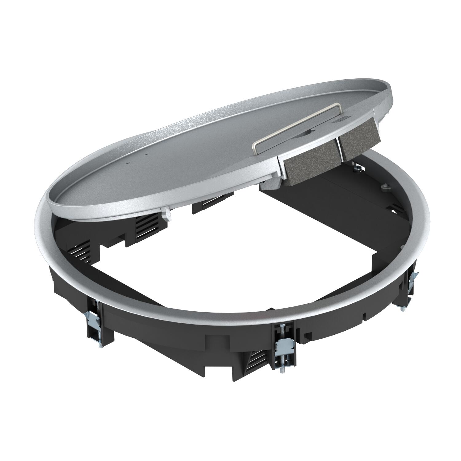 Adecuado para canalización bajo pavimento sí Altura del piso mín. 78 mm Apropiado para canal bajo suelo sí Apropiado para instalación de suelo técnico sí Apropiado para limpieza con agua no Apropiado para montaje en suelo hueco / técnico sí Autorizaciones VDE Carga vertical, superficie grande hasta 5.000 N Carga vertical, superficie pequeña hasta 3.000 N Con entalladura para revestimiento de suelo sí Cuidados del suelo seco Diámetro de montaje 305 Diámetro exterior 323 mm Dimensión Ø323x70 Espesor del revestimiento del suelo 10 mm Grado de protección (IP) mientras se está utilizando IP20 Grado de protección (IP) si no se está utilizando IP10 Grado de protección código IK IK10 Huella de CO2 (GWP) Cradle-to-Gate 18,3614 kg CO2e / 1 Unidad Marco para revestimiento del suelo sí Material Aluminio fundido Mecanismo de apertura Asidero Modelo para carga pesada no Número de cajas portamecanismos 3 Número de dispositivos instalables 12 Posibilidad de instalar una junta no Profundidad de montaje 78 mm Rango de sujeción D máx. 33 mm Rango de sujeción D mín. 3 mm Soportes para alojar cajas portamecanismos sí Tamaño nominal para unidades portamecanismos R9 Tipo de sistema de montaje UT4 Versión redondo - Todos los tipos