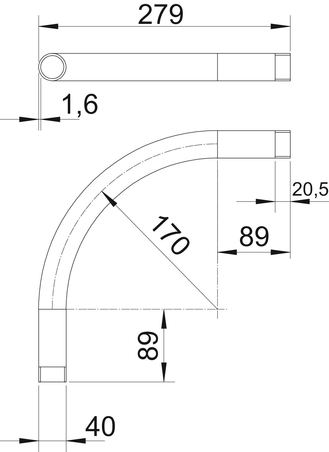 Ángulo del codo 90 ° Color negro intenso; RAL 9005 Con abertura de inspección y tapa no Con manguito sí De dos partes no Dimensión M40x1,5 Flexible no Huella de CO2 (GWP) Cradle-to-Gate 1,7049 kg CO2e / 1 Unidad Libre de halógenos no Material Acero Medida A 89 mm Medida B 279 mm Medida D 40 mm Medida l 20,5 mm Medida m (mm) M40 Medida R 170 mm Medida t 1,6 mm Para diámetro de tubo nominal 40 mm Rosca M40x1,5 Superficie PES50 - poliéster/epoxi Superficie pulida no Superficie pulida no Versión Rosca - Todos los tipos