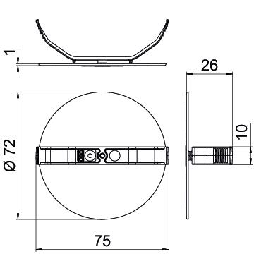Altura 26 mm Ancho 72 mm Antiinflamable según la norma VDE 0471/DIN 695 parte 2-1, temperatura de ensayo 650 °C Color Negro Con tornillos no Diámetro 60 mm Dimensión Ø72 Ejecución redondo Libre de halógenos sí Longitud 75 mm Material Poliestireno Precintable no Tipo de fijación Tapa de resorte - Todos los tipos