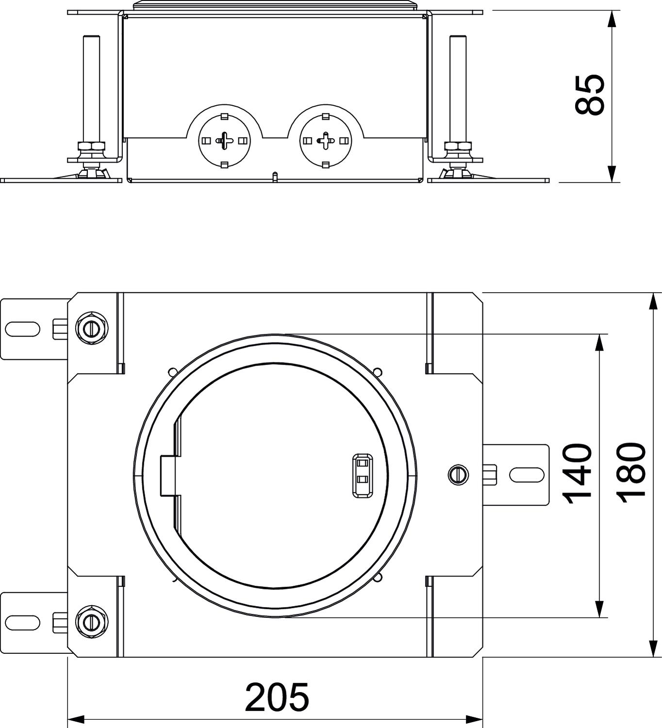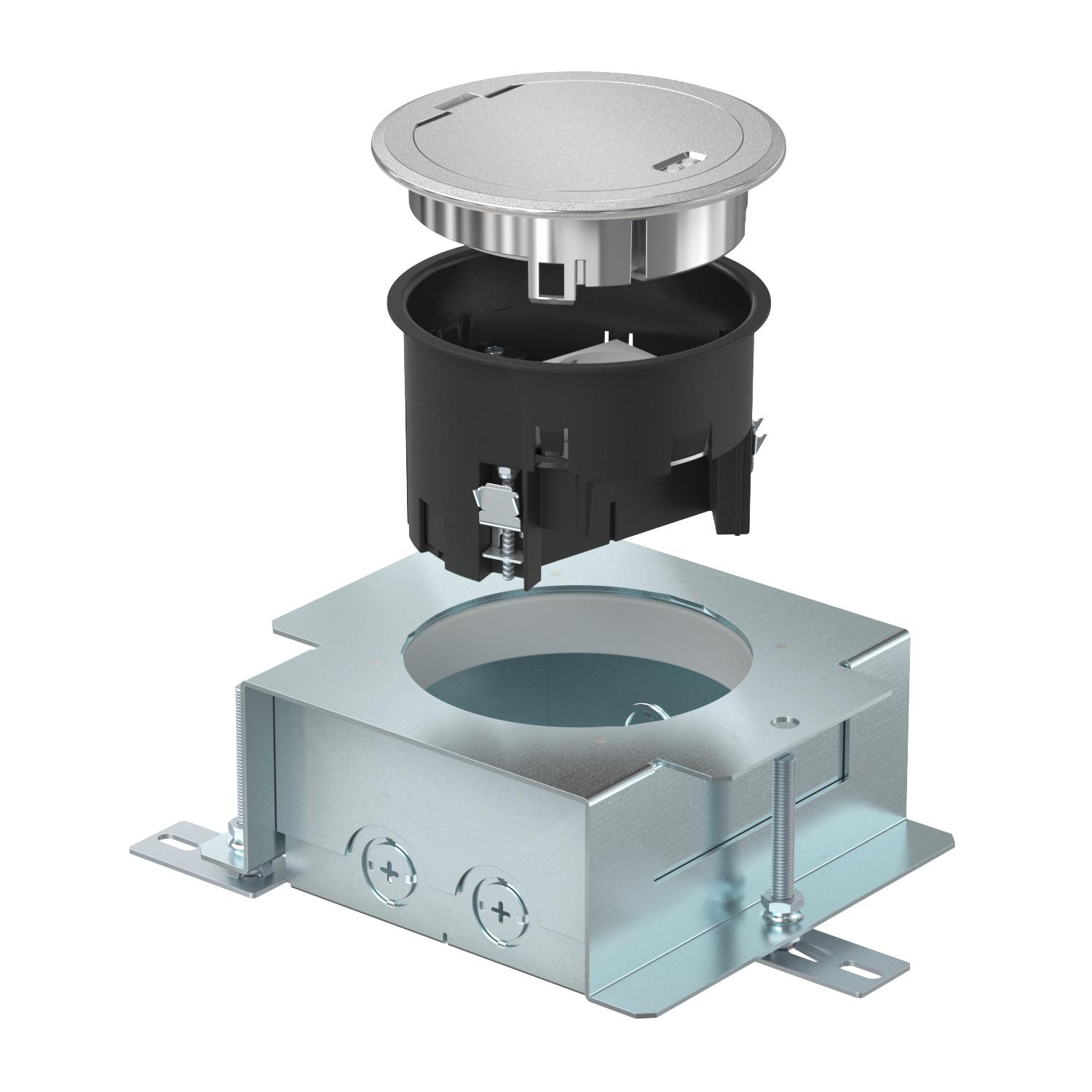 Descripción de productoUnidad de instalación redonda GES R2 con tapa abatible, marco de protección revestimiento de suelo y caja para solado UD GES R2 para instalación en suelos de pavimento continuo Se suministra con una toma de corriente doble con puesta a tierra con contactos desplazados 33º. En el lateral, junto a la toma, se pueden conectar hasta 2 conectores de datos. Cuando la unidad está cerrada se puede limpiar con agua. La profundidad mínima de montaje es de 85 mm. Superficie cromada.