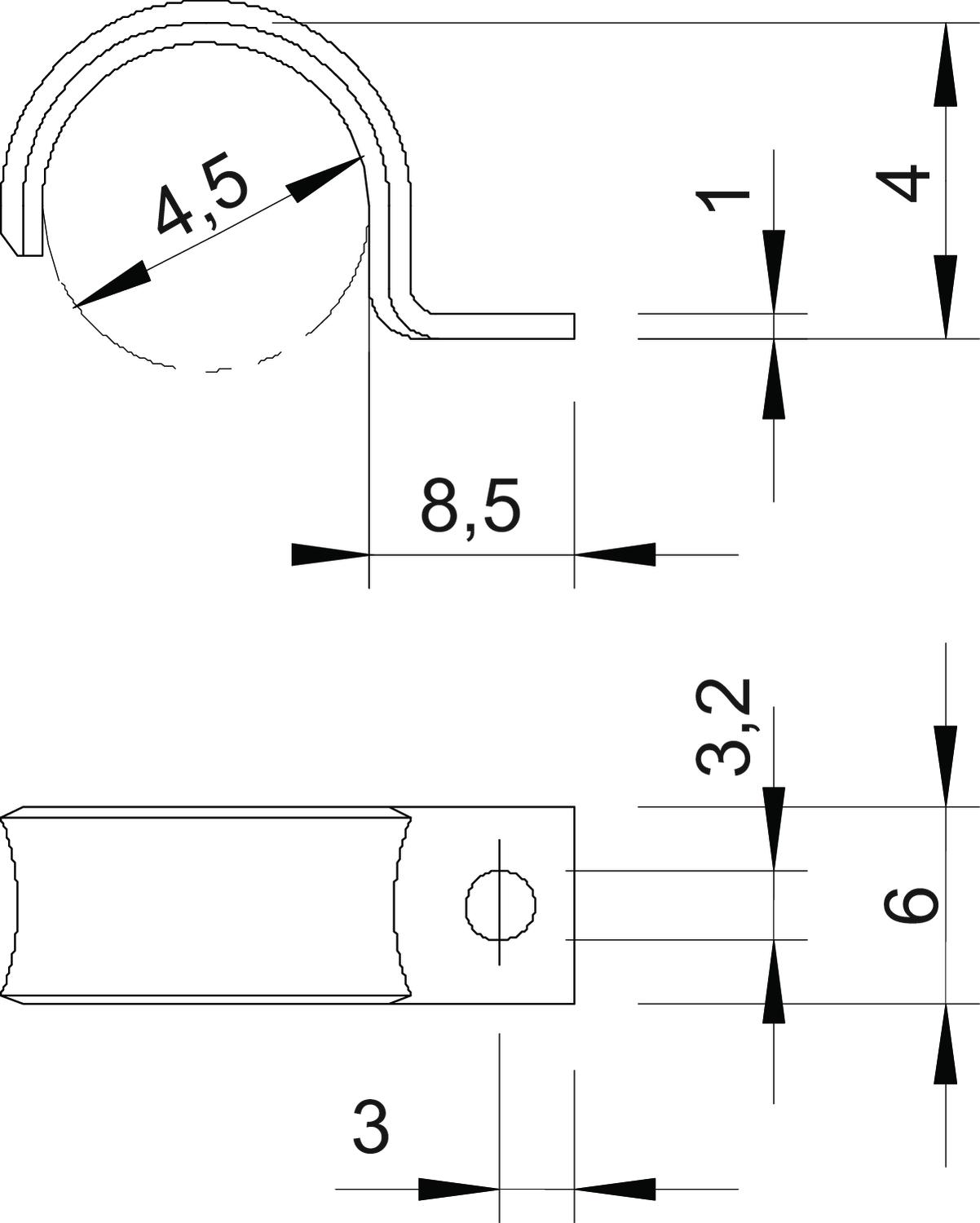 Altura 4 mm Ancho 6 mm Apropiado para área de protección contra incendios no Diámetro nominal 4,5 mm Dimensión 4,5mm Distancia hasta la pared no Grosor del material 1 mm Huella de CO2 (GWP) Cradle-to-Gate 0,0017 kg CO2e / 1 Unidad Libre de halógenos sí Longitud 8,5 mm Material Acero Medida A 3 mm Medida b 6 mm Medida D 4,5 mm Medida d 3,2 mm Medida H 4 mm Medida L 8,5 mm Medida t 1 mm Número de cables / tubos 1 para el diámetro 4,5 recubierto de plástico no Resistente a los UV sí Superficie Galvanizado, pasivado transparente Tamaño del orificio 3,2 mm Tipo de fijación Agujero de rosca Versión De una sola tira - Todos los tipos