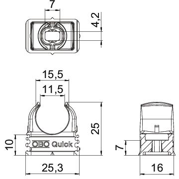 Descripción de productoFlush-mounted clip to accept metric steel armoured pipes and heavy-duty insulating pipes, as well as Quick Pipe electrical installation pipes. Universal fastening options on walls and ceilings, both in indoor and protected outdoor areas. With slot for side alignment during mounting with wood screw or knock-in anchor. Toolless pipe mounting. Can also be arranged with OBO Multi-Quick or proQuick clip. M16–M32 size can be screwed onto M6 thread. Recommended fastening spacing 50–60 cm, for max. extraction values F at a room temperature of 20 °C, see the table.