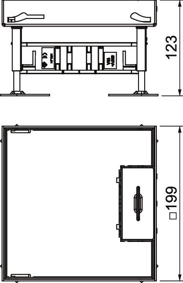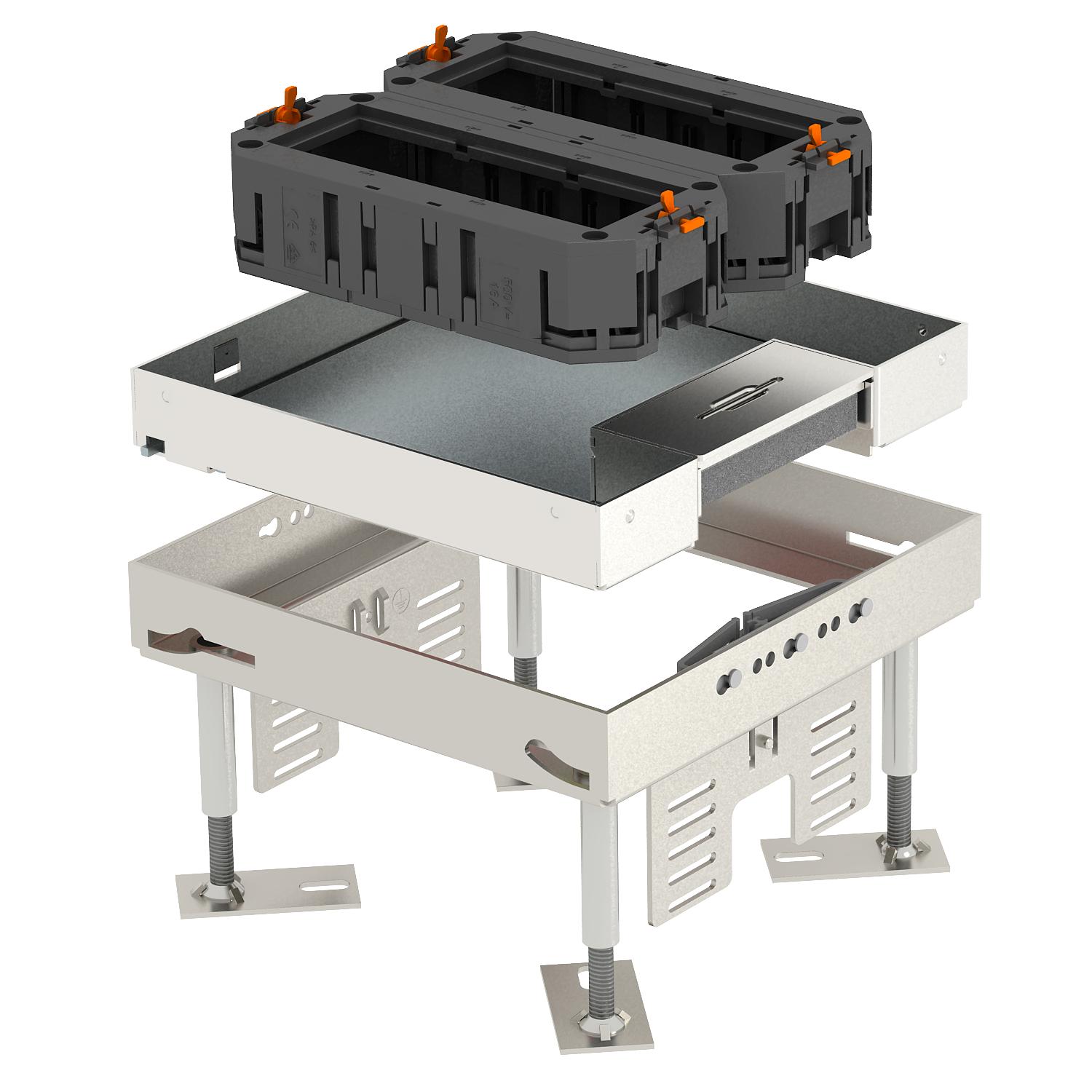 - Dos soportes universales UT3/45 para tres mecanismos Modul 45® cada uno. Caja y salida de cable de acero inoxidable. Rebaje de pavimento en la caja: 25 mm.