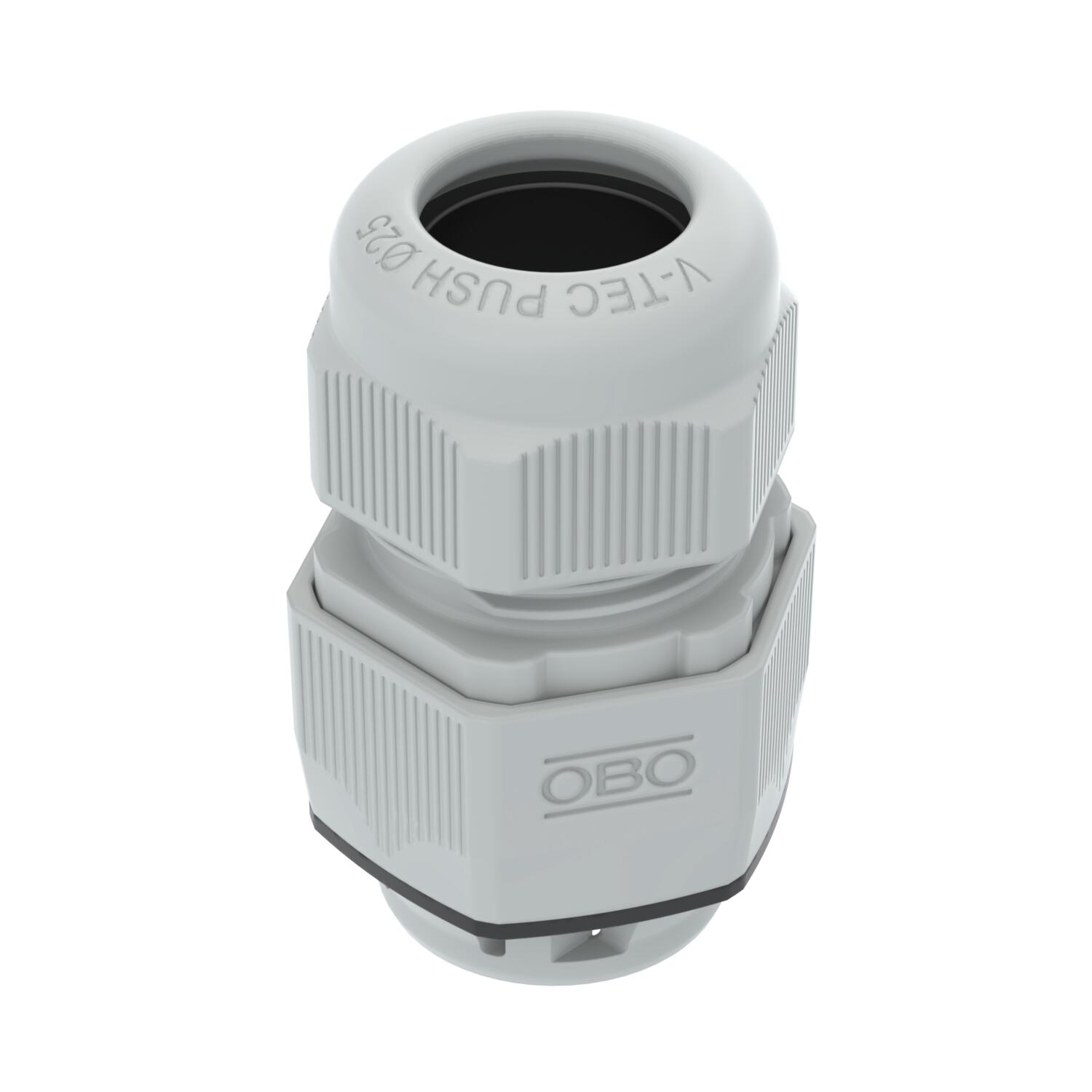 Descripción de productoCable gland V-TEC PUSH® with patented snap-in system and metal spring for use in, for example, junction boxes, housings or distributor cabinets in private and industrial applications. Single-sided plug-in, screwless fastening, no locknut required. Can be removed again with the enclosed dismantling tool. Suitable for wall thicknesses from 1–3 mm. With strain relief and integrated sealing lip, tested according to DIN EN 62444. Protection class IP66. Can be used between –20 °C and +65 °C.