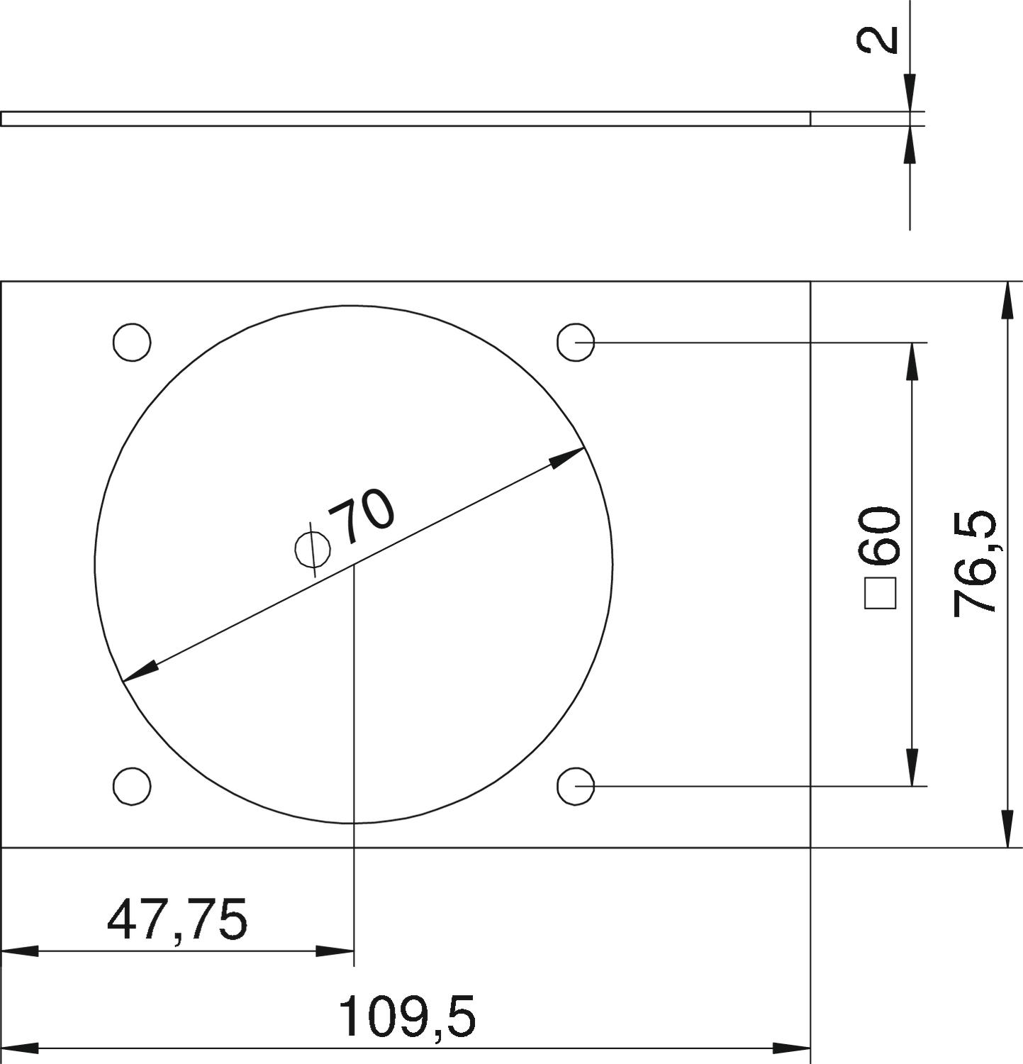 Descripción de productoTapeta con 1 troquel (Ø 70 mm) y fijación roscada 60 x 60 mm para tomas de corriente CEE, para montar en la cara lateral mayor de T4B (ocupa 1/1 cara).