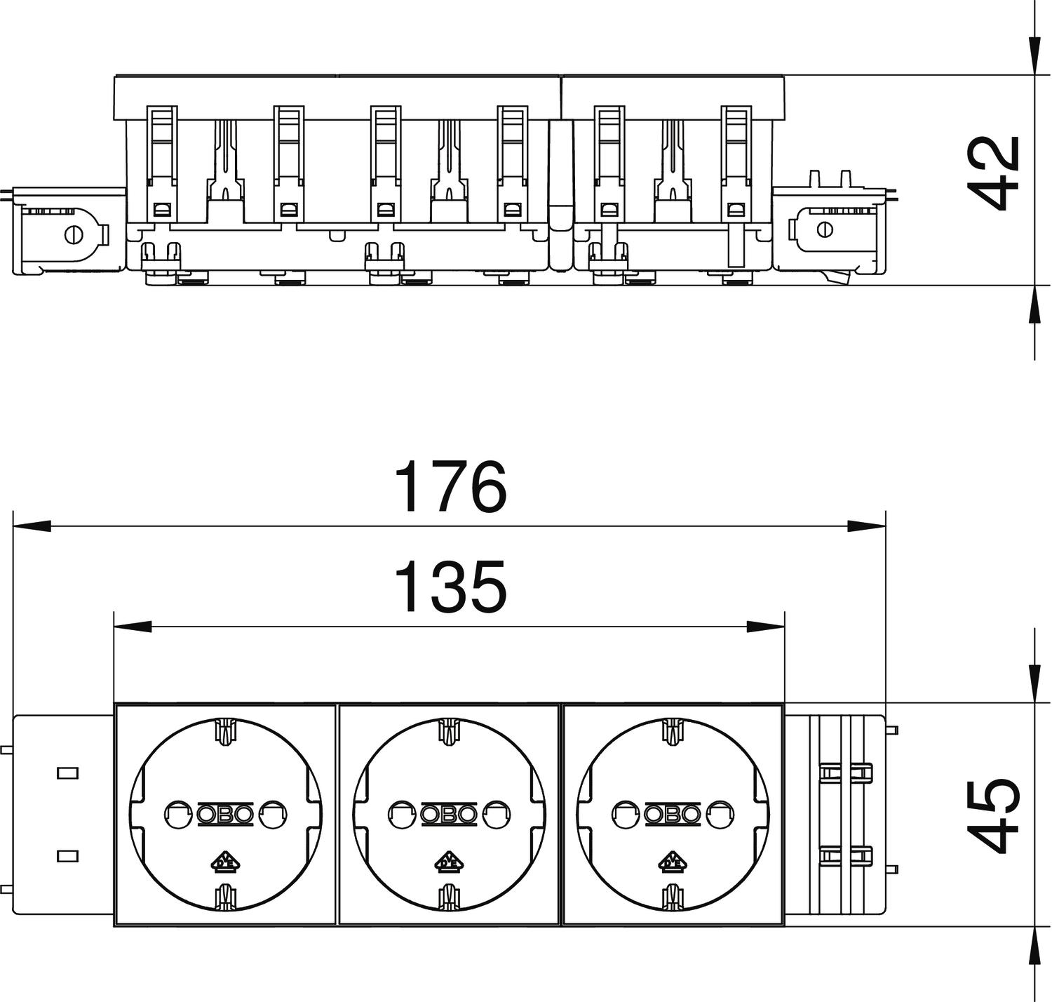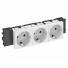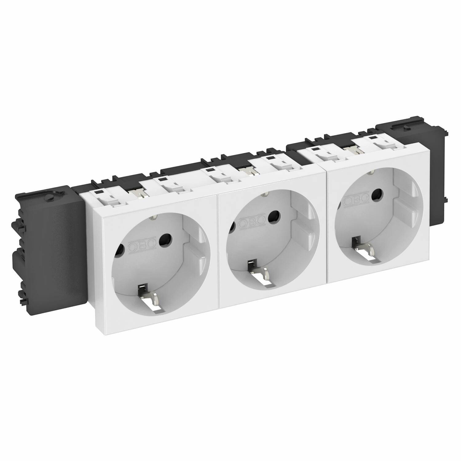 Descripción de productoToma de corriente con toma a tierra con conexión lateral triple, 0°, con protección elevada contra rozamiento, con bornes de enchufe, de 2 polos, 16 A, 250 V~, con bornes de unión según IEC 60884-1, adecuada para el montaje en sistemas de canal portamecanismos Rapid 45.