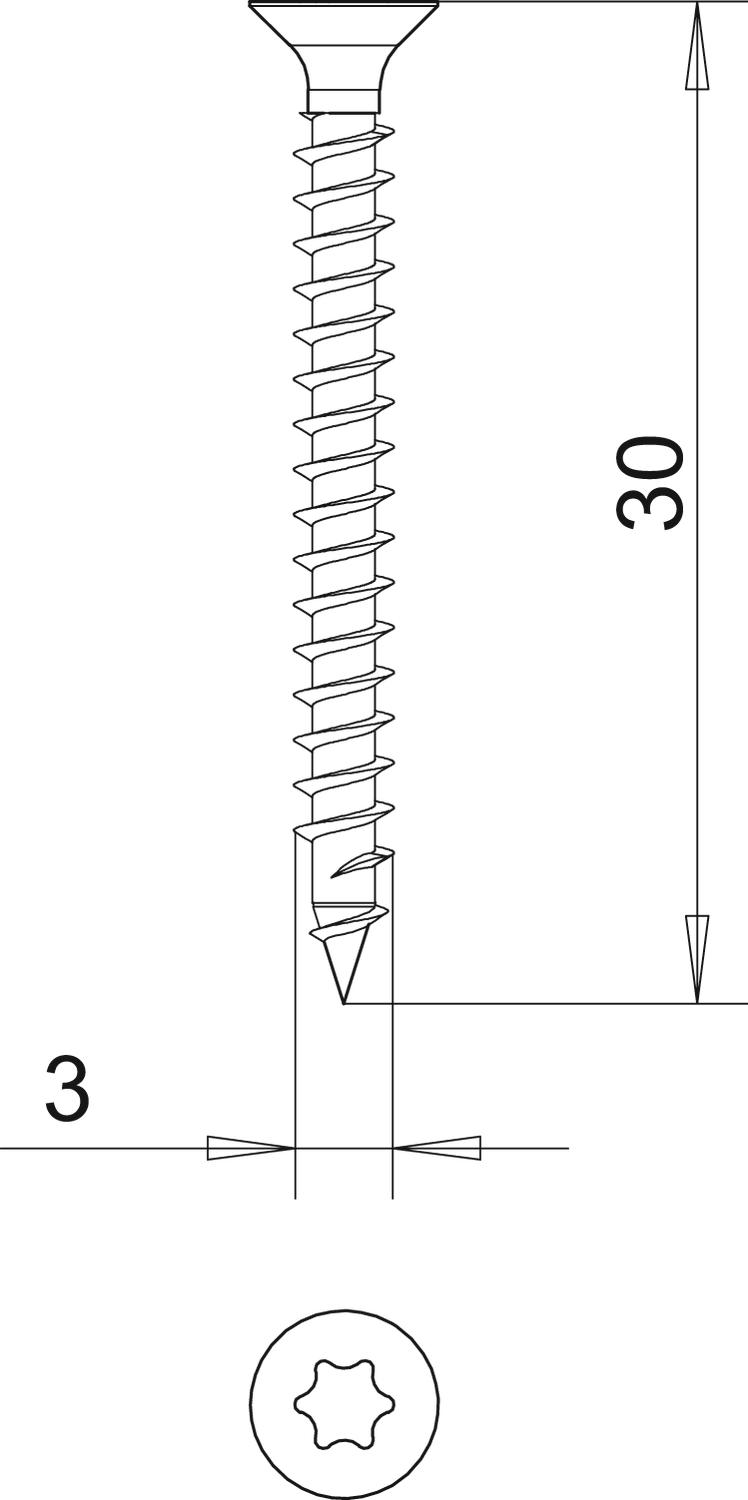 Diámetro de la cabeza 5,6 mm Dimensión 3x30mm endurecido sí Forma de la cabeza Cabeza avellanada Longitud 30 mm Material Acero Medida D 3 mm Medida L 30 mm Sistema roscado Torx Superficie electrozincado - Todos los tipos