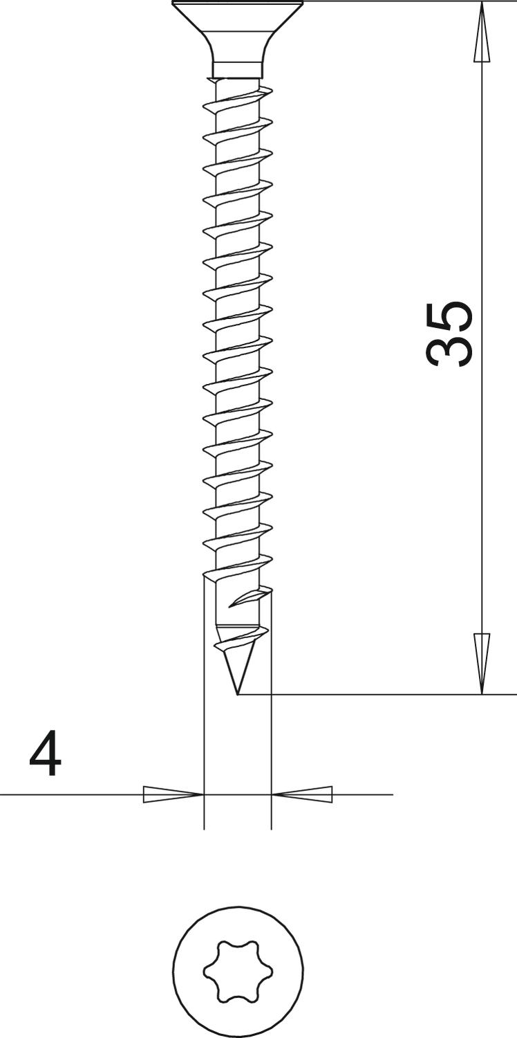 Diámetro de la cabeza 7,5 mm Dimensión 4x35mm endurecido sí Forma de la cabeza Cabeza avellanada Longitud 35 mm Material Acero Medida D 4 mm Medida L 35 mm Sistema roscado Torx Superficie electrozincado - Todos los tipos