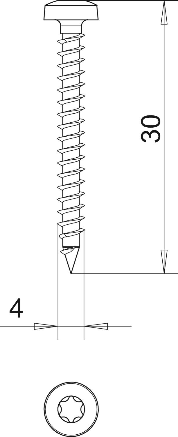 De doble vía sí Diámetro de la cabeza 7,5 mm Dimensión 4x30mm endurecido sí Forma de la cabeza Tornillo de anclaje con cabeza redonda Grosor 4 mm Longitud 30 mm Material Acero Medida D 4 mm Medida L 30 mm Sistema roscado Torx Superficie electrozincado - Todos los tipos