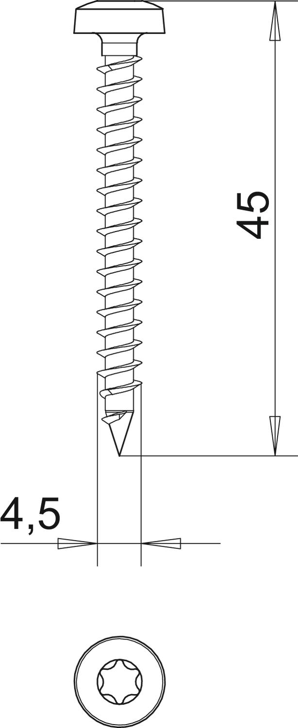 De doble vía sí Diámetro de la cabeza 8,2 mm Dimensión 4,5x45mm endurecido sí Forma de la cabeza Tornillo de anclaje con cabeza redonda Grosor 4,5 mm Longitud 45 mm Material Acero Medida D 4,5 mm Medida L 45 mm Sistema roscado Torx Superficie electrozincado - Todos los tipos