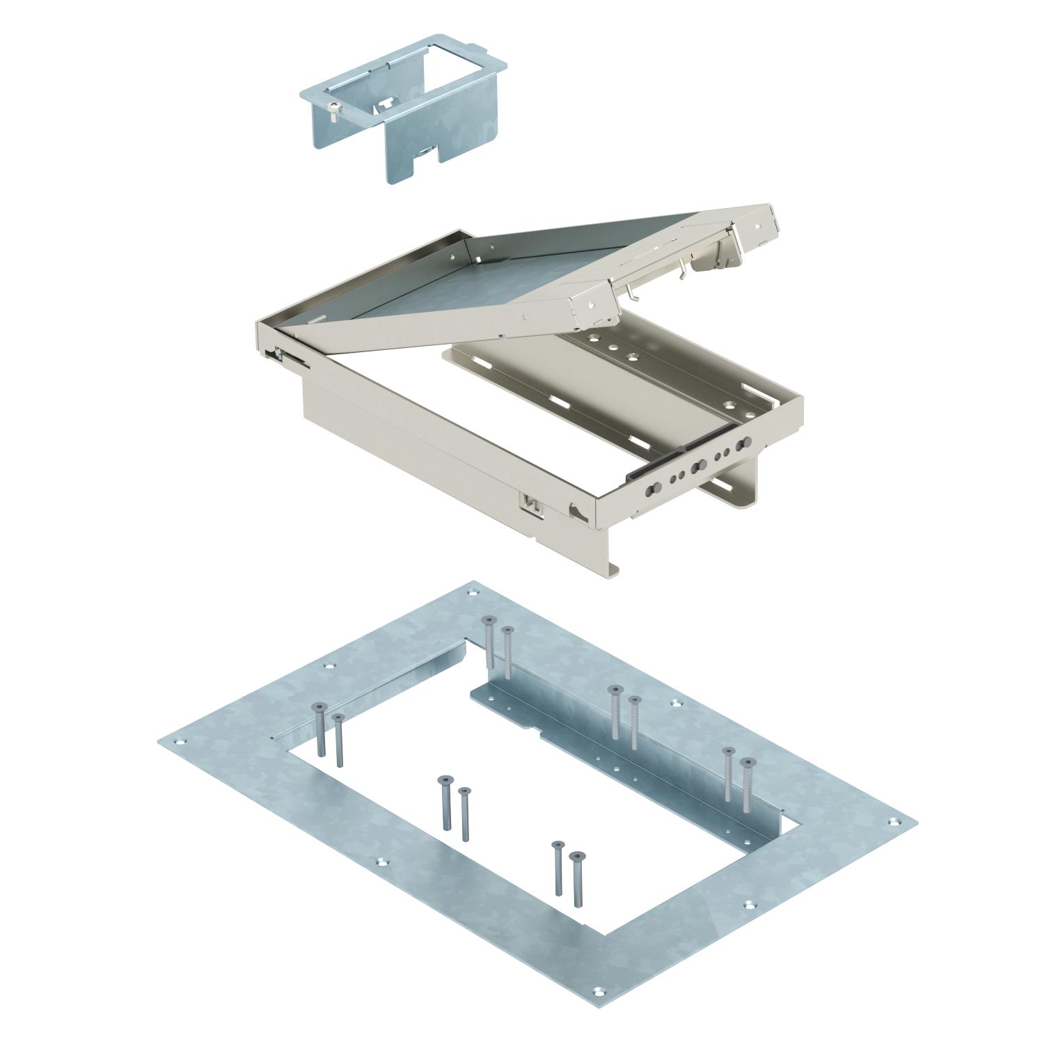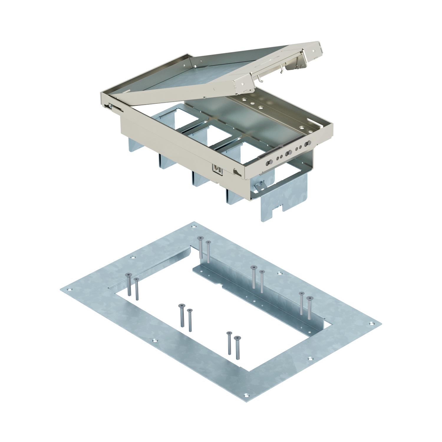 Descripción de productoConjunto de tapas y marcos de altura regulable con salida de cables para el montaje directo en techos huecos.