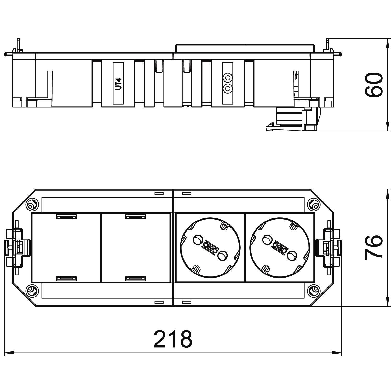 Descripción de productoEl soporte universal UTC4 listo para conectar tiene dos tomas de corriente con toma de tierra 33º preinstaladas con 16 A y dos tapas ciegas para el montaje posterior de dos mecanismos de la serie Modul 45 o Modul 45connect. Adecuado para los cables de conexión VL y para su uso en las cajas portamecanismos del tamaño nominal R7, R9 y 9.