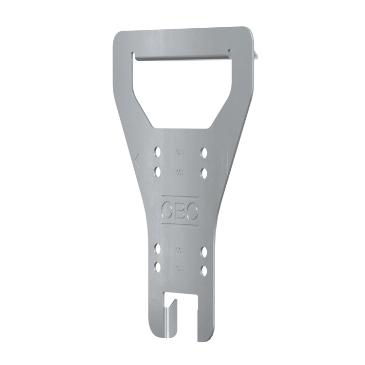 This includes, for example, cover clamps for mounting the chequer plate cover and the matching cover lifter to easily disassemble the cover again. At the same time, the cover lifter can be used as a drilling template for connector perforations, for example to mount the RUVK universal connector. As a connector for every direction, it can be used as both a straight and angled connector. The optimised rounded inner edge of the connector reliably protects cables against damage during pulling. A cover support provides additional support for the cover. It also features rounded edges, which protects the cables during installation.