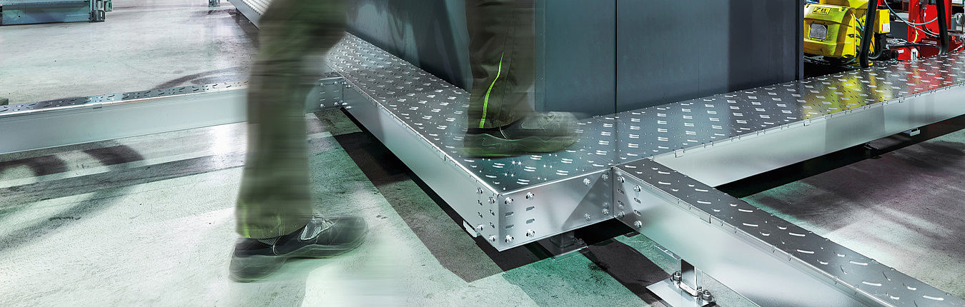 Heavy loads, stamping feet, dirt, dust – the enclosed, walkable cable tray system can handle all of this and more thanks to its ingenious system design. In rough environments, it protects cable reliably against damage.