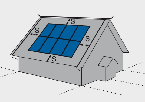 According to DIN EN 62305, the lightning protection system must be erected at a separation distance (s) from the parts of the photovoltaic system. Usually, a separation distance (s) (= safety distance) of 0.5 m to 1 m is sufficient.