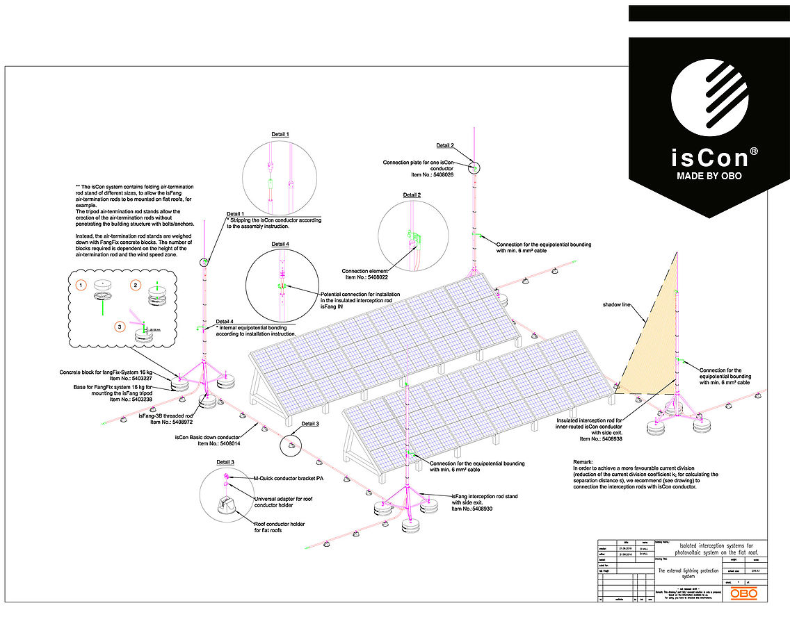 The air-termination rods are to be positioned in such a way that there is no shading of the photovoltaic modules. A core shadow is sufficient to incur reductions in performance for the entire string. According to VDE 0185-305-3, Supplementary Sheet 5, an air-termination rod must be located at least 108x the diameter of the module away. In doing this, care should be taken that the photovoltaic system remains in the protection area of the air-termination rods. With the high-voltage-resistant, insulated isCon® system from OBO, the separation distance can be maintained safely.