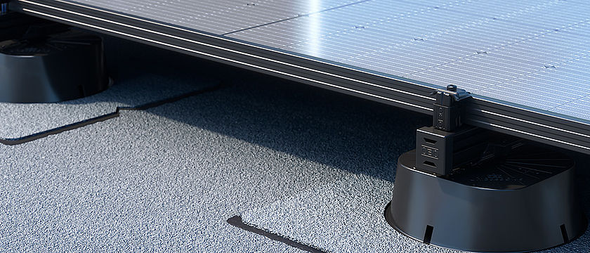 Our Basic system for flat roofs is highly resilient and quick to install. It is notable for its integrated cable routing system and simultaneous ballasting. The system is infinitely variable thanks to a flexible ridge gap.