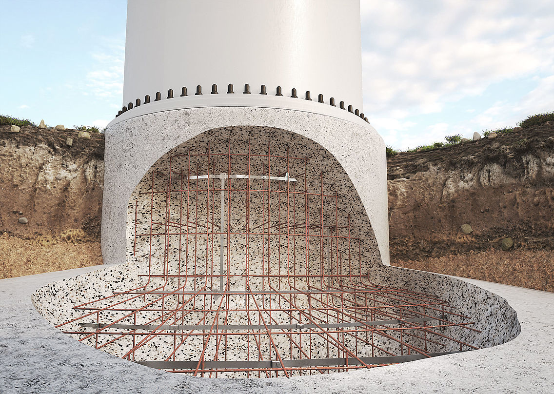 The foundation of a wind power plant fulfils several tasks as the transition point between the tower and the ground: On the one hand, it prevents the wind power plant from falling over or sinking, and on the other hand, it transfers all loads resulting from the rotor and the turbine movements to the ground. Most foundations for onshore wind power plants, i.e. in the onshore area, are so-called shallow foundations. They consist of mostly round slabs made of concrete and steel, which are inserted into the ground and transfer the forces evenly into the substrate. Deep foundations or pile foundations are used for substrates with poor bearing capacity. To provide sufficient strength, the foundation plate is provided with piles in the process. The loads are thus transferred to soil layers with a higher load-bearing capacity. The design of the foundation is determined partly by the size of the wind power plant and partly by the soil conditions. It can be octagonal, circular or cross-shaped, for example.