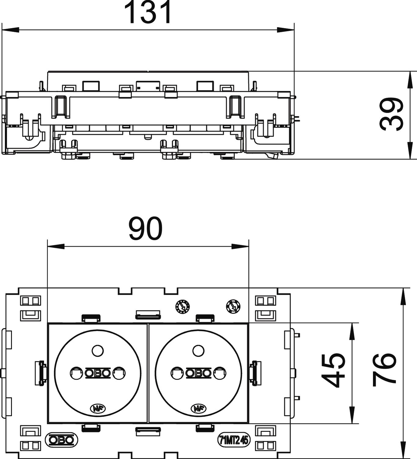 Approvals VDE Closable no CO2 Footprint (GWP) Cradle-to-Gate 0,5845 kg CO2e / 1 Piece Coding no Colour Aluminium painted Connection type Screwless terminal Cover Central plate Depth 39 mm Dimension 250V, 10/16A Ejection mechanism no Error current protection no Fastening type Lock For more difficult conditions (according to VDE) no Halogen-free yes Height 76 mm Hinged cover no increased touch protection yes Insulated installation no Labelling panel no Material Polycarbonate Mounting type Device installation duct Nominal current 16 A Nominal voltage 250 V Number of poles 2 Number of units 2 Operating temperature, max. 40 °C Operating temperature, min. -5 °C Printed label/coding Without printing Protection rating Other Rotated central insert no Socket angle 0° Socket version NF Special power supply Without special power supply Surface version Matt Surge protection no Transparent no Version for Double 0° Warning light no Width 131 mm With fine-wire fuse no With functional lighting no With on/off switch no With orientation lighting no - All types