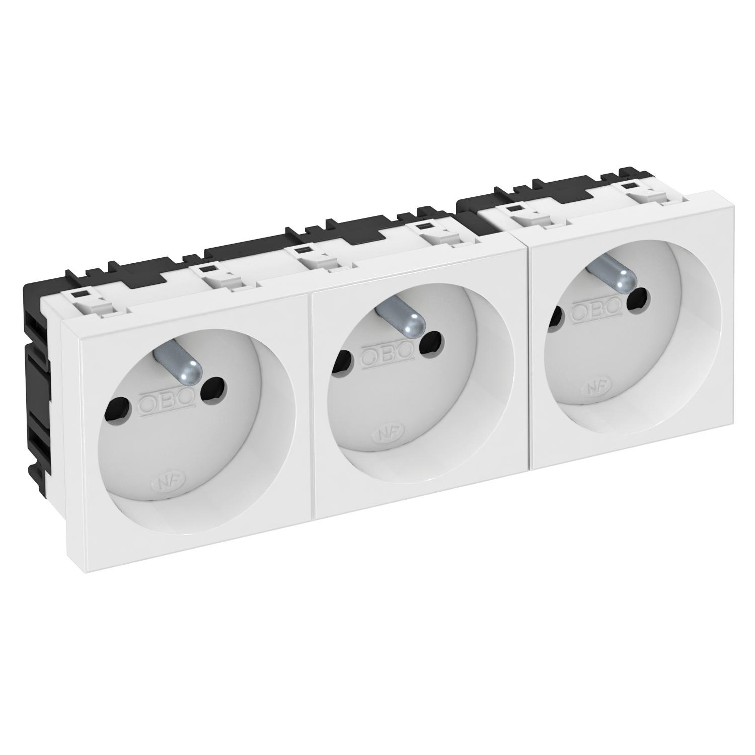 Product descriptionSocket with earthing pin, triple 0°, with increased touch protection, with screwless terminals, 2-pin, 16 A, 250 V~, with connection terminals to IEC 60884-1.