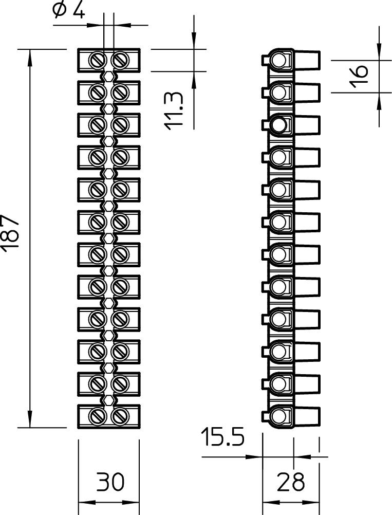 Ambient temperature 80 °C Closing plate required no Colour White Connectable conductor cross-section, fine-wire without wire-end ferrule, max. 16 mm² Connectable conductor cross-section, fine-wire without wire-end ferrule, min. 16 mm² Connectable conductor cross-section, multi-wire, max. 25 mm² Connectable conductor cross-section, multi-wire, min. 25 mm² Connection position Side Cross-section Max. attachment each side: 25 mm² multi-wire or 16 mm² fine-wire mm² Dimension 25,0mm² Drill hole spacing, centre 16 mm Explosion-tested version no Height 28 mm Length 187 mm Material Polypropylene No. of terminals 12 Nominal cross-section, min. 25 mm² Nominal current 101 A Nominal voltage 750 V Number of screwless terminals per pole 2 Permitted temperature range, max. 80 °C Permitted temperature range, min. -5 °C Pole number 12 Suitable for flexible conductors yes Suitable for multi-wire conductors yes Suitable for solid conductors yes Transparent no Version of electrical connection 1 Screw connection Version of electrical connection 2 Screw connection Width 30 mm - All types