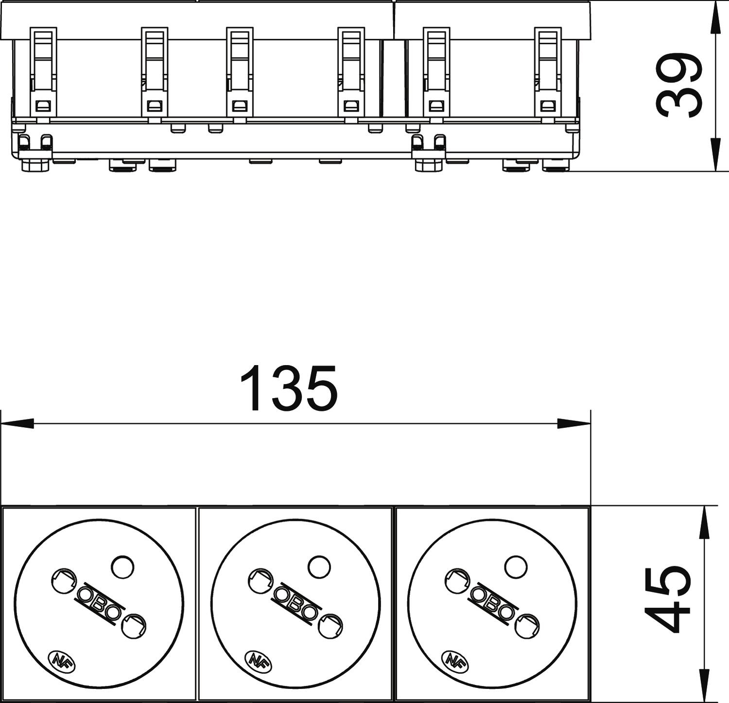 Approvals VDE Closable no CO2 Footprint (GWP) Cradle-to-Gate 0,5599 kg CO2e / 1 Piece Coding no Colour Pure white; RAL 9010 Connection type Screwless terminal Cover Central plate Depth 39 mm Dimension 250V, 10/16A Ejection mechanism no Error current protection no Fastening type Lock For more difficult conditions (according to VDE) no Halogen-free yes Height 45 mm Hinged cover no increased touch protection yes Insulated installation no Labelling panel no Material Polycarbonate Mounting type Device installation duct Nominal current 16 A Nominal voltage 250 V Number of modules (for modular construction) 3 Number of poles 2 Number of units 3 Operating temperature, max. 40 °C Operating temperature, min. -5 °C Printed label/coding Without printing Protection rating Other Rotated central insert yes Socket angle 33° Socket version NF Special power supply Without special power supply Surface version Matt Surge protection no Transparent no Version for Triple 33° Warning light no Width 135 mm With fine-wire fuse no With functional lighting no With on/off switch no With orientation lighting no - All types