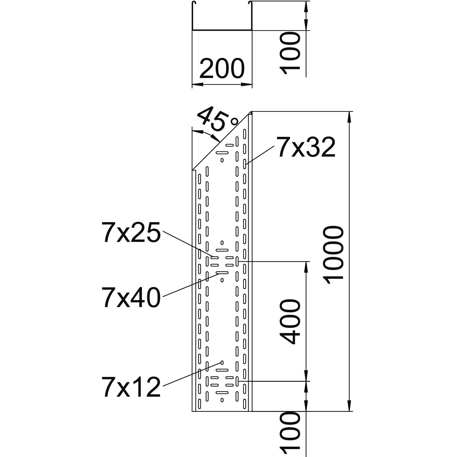 Bend (angle) 45° Change of direction Horizontal CO2 Footprint (GWP) Cradle-to-Gate 17,7554 kg CO2e / 1 Piece Colour zinc Connector version Without connectors Dimension 100x200x1000 Dimension B 200 mm Dimension H 100 mm Dimension L 1000 mm Height 100 mm Length 1000 mm Maintain electrical functions no Material Steel Mounting perforation in base yes NATO hole pattern no Permitted temperature range, max. 120 °C Permitted temperature range, min. -20 °C Plate thickness 2 mm Rustproof steel, pickled no Side perforation yes Surface Strip galvanized Type Bend, rigid Type of connector, cable support system Screwed Wide-span version no Width 200 mm - All types