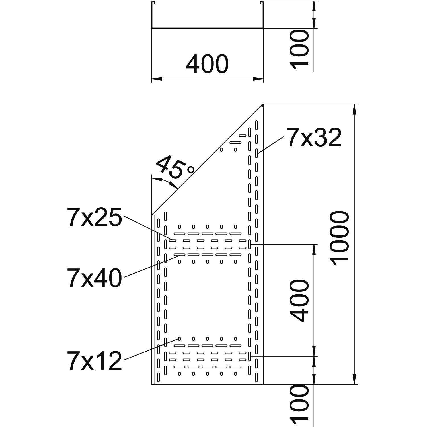 Bend (angle) 45° Change of direction Horizontal CO2 Footprint (GWP) Cradle-to-Gate 26,5256 kg CO2e / 1 Piece Colour zinc Connector version Without connectors Dimension 100x400x1000 Dimension B 400 mm Dimension H 100 mm Dimension L 1000 mm Height 100 mm Length 1000 mm Maintain electrical functions no Material Steel Mounting perforation in base yes NATO hole pattern no Permitted temperature range, max. 120 °C Permitted temperature range, min. -20 °C Plate thickness 2 mm Rustproof steel, pickled no Side perforation yes Surface Strip galvanized Type Bend, rigid Type of connector, cable support system Screwed Wide-span version no Width 400 mm - All types